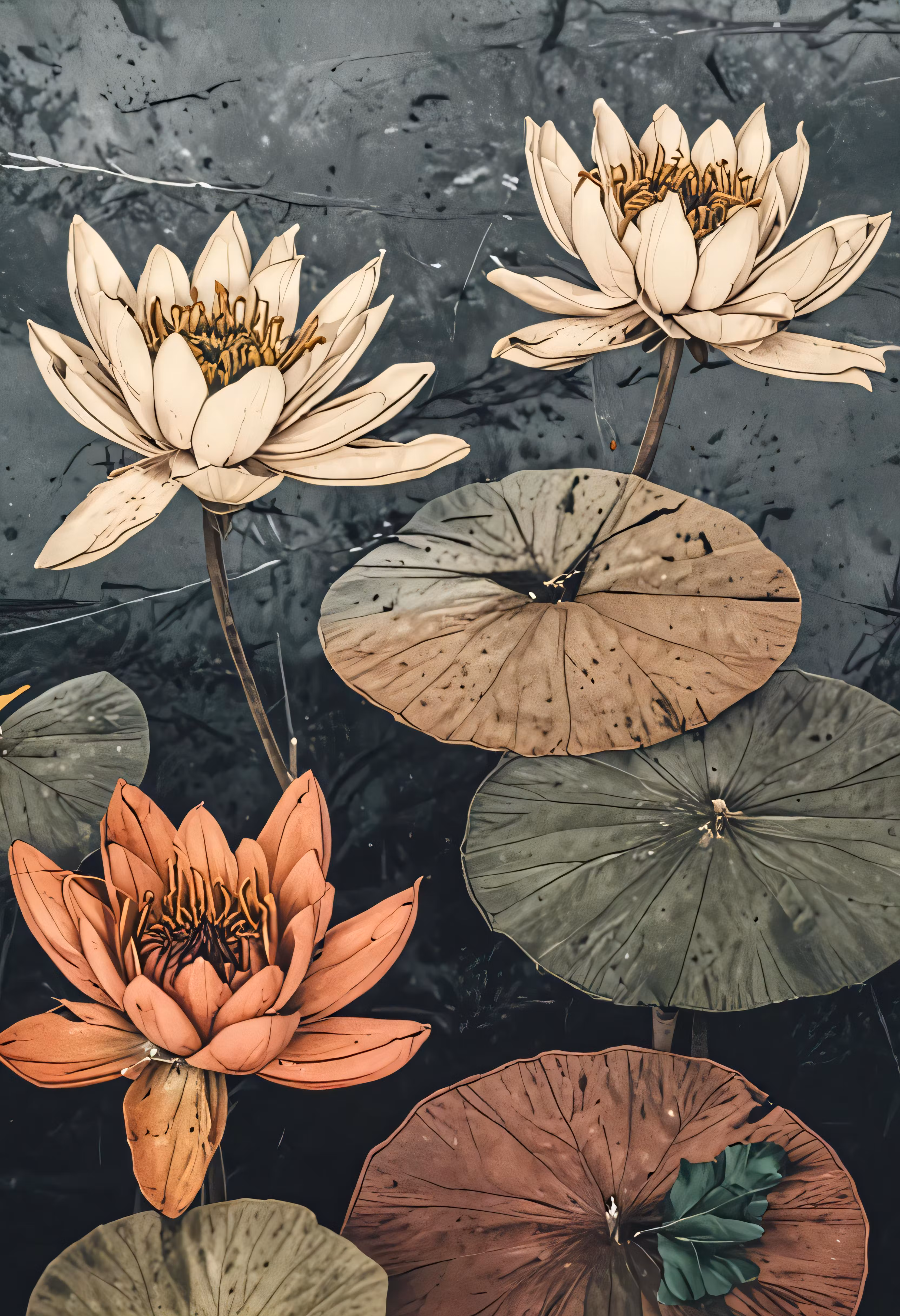 High resolution picture, free to use, waterlilies and leaves floating in a pond in the rain