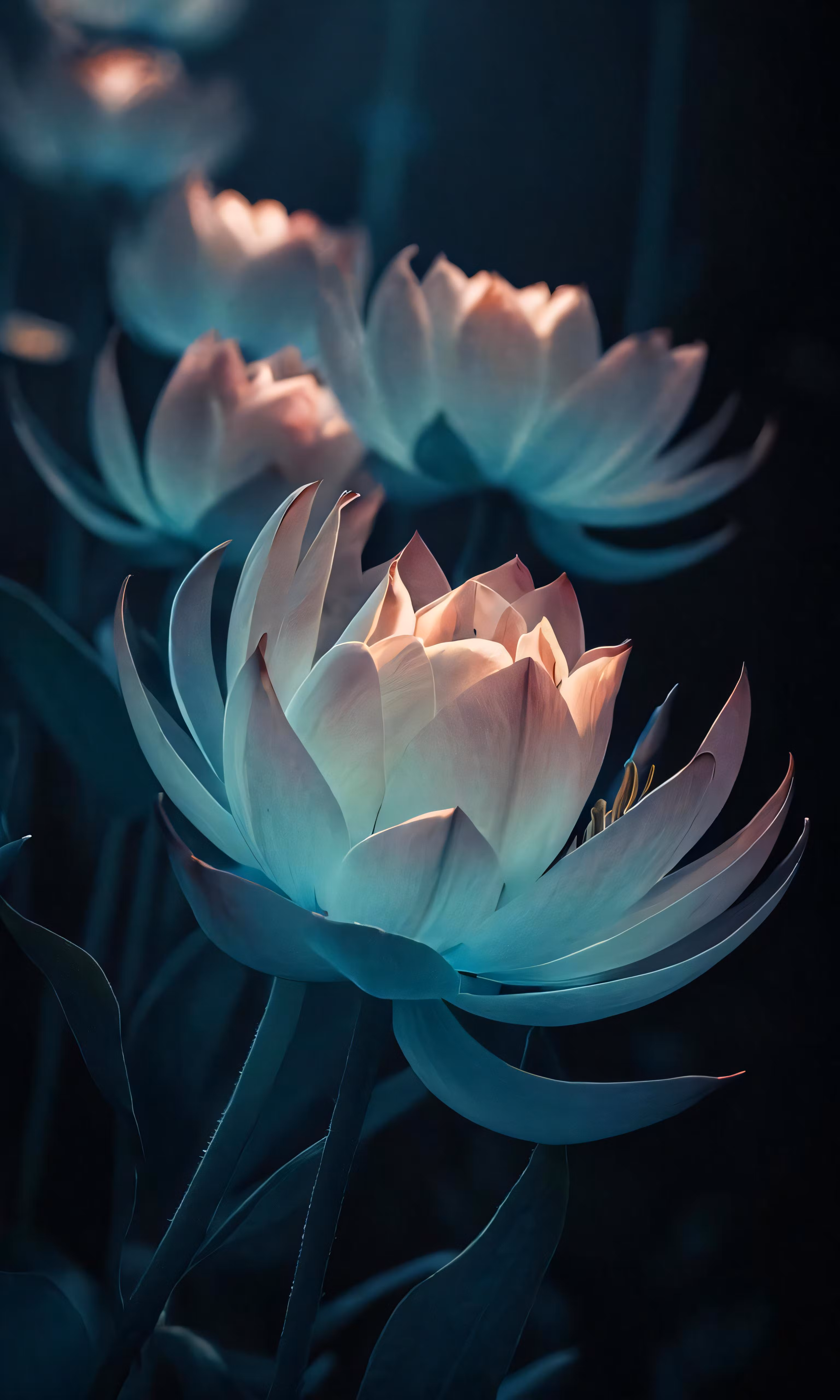 High resolution picture, free to use, white lotuses bloom in the sun and green stems