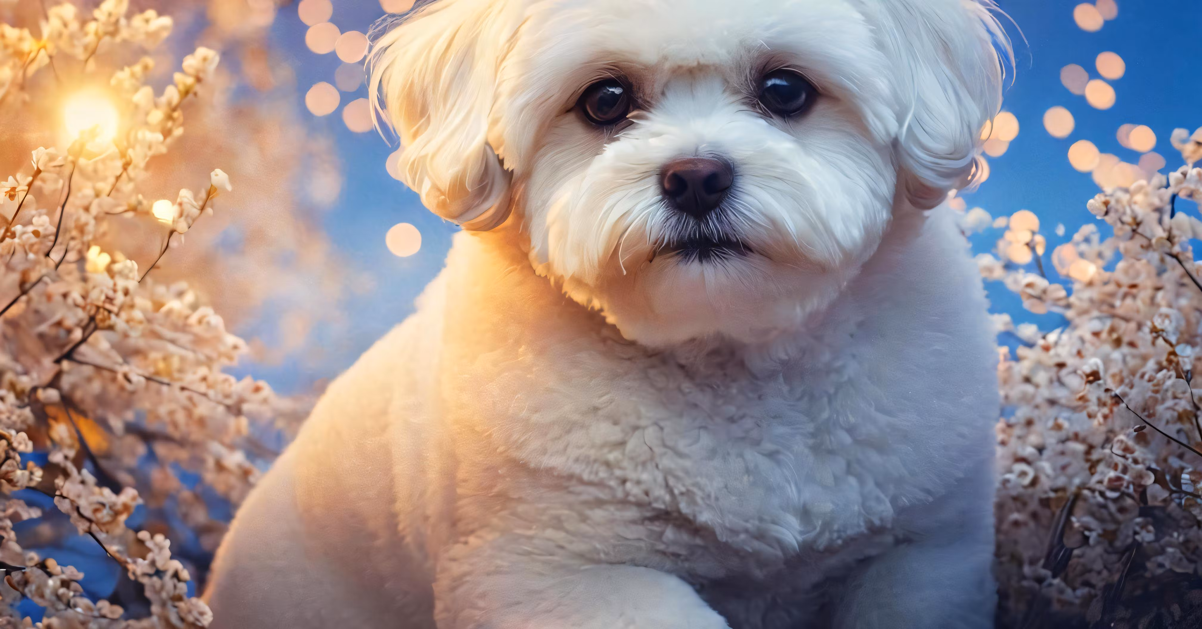 High resolution picture, free to use, white poodle with blue eyes and yellow highlights on its fur