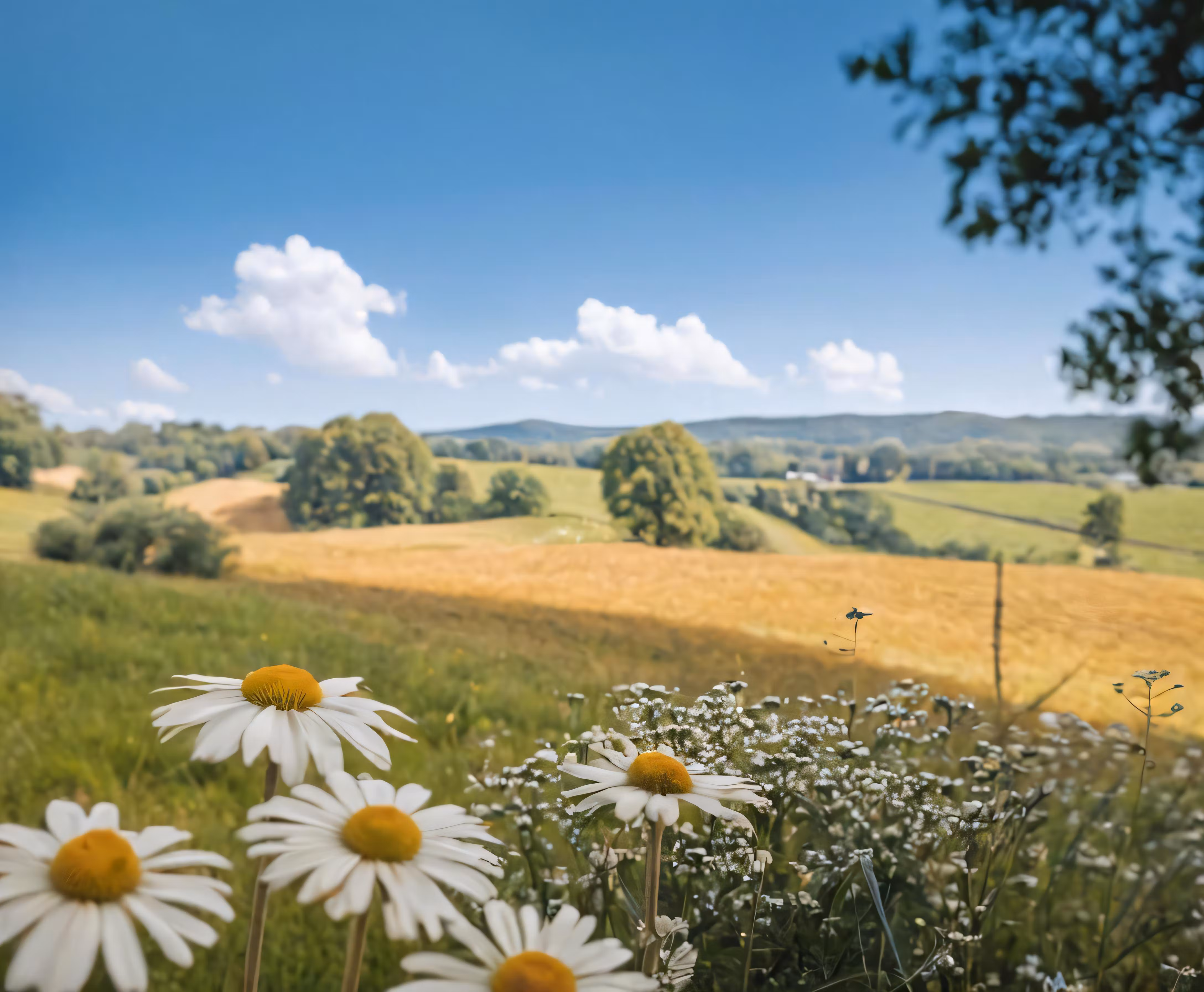 High resolution picture, free to use, wild flowers grow in the grass with blue sky