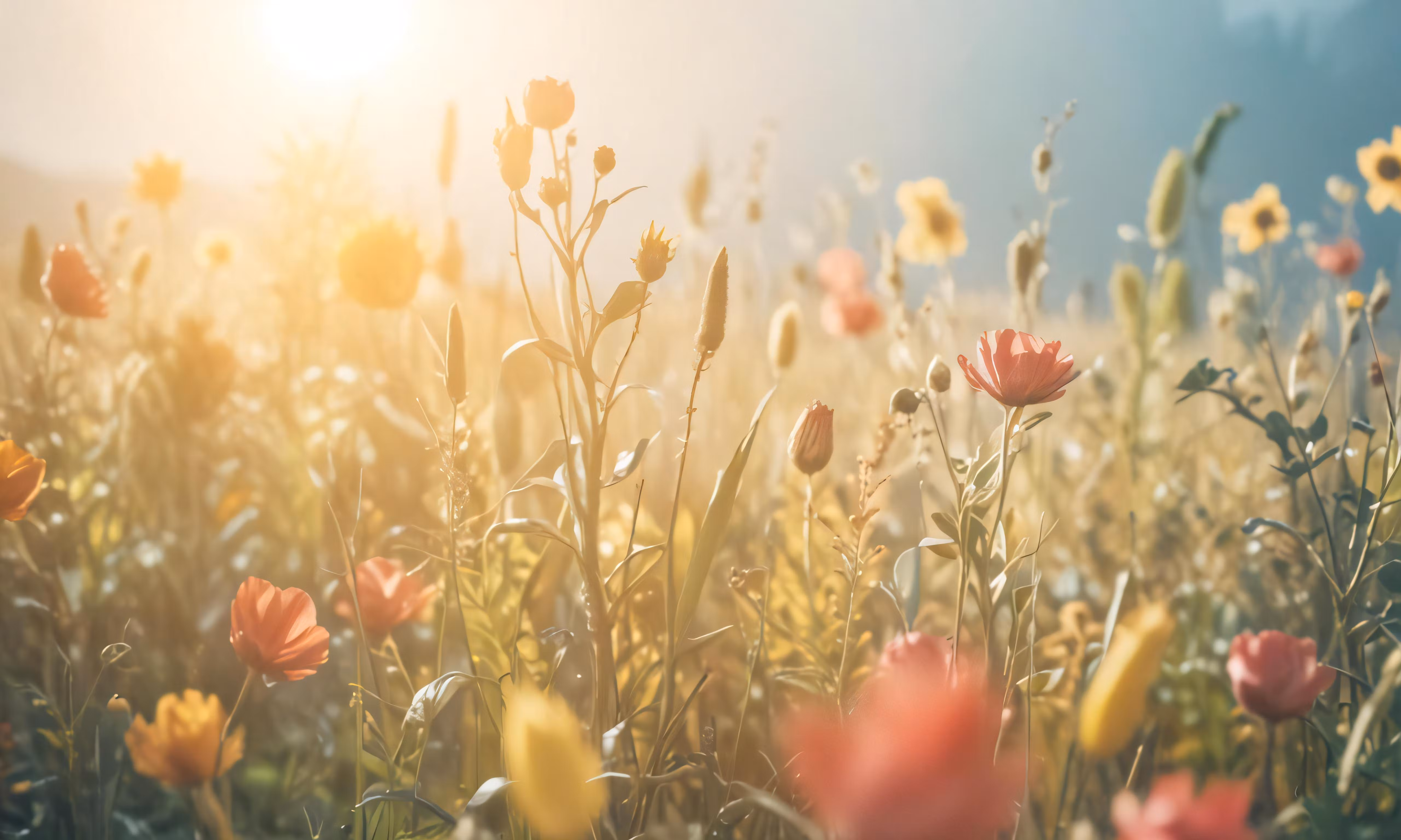 High resolution picture, free to use, wild flowers in a field with the sun in the background