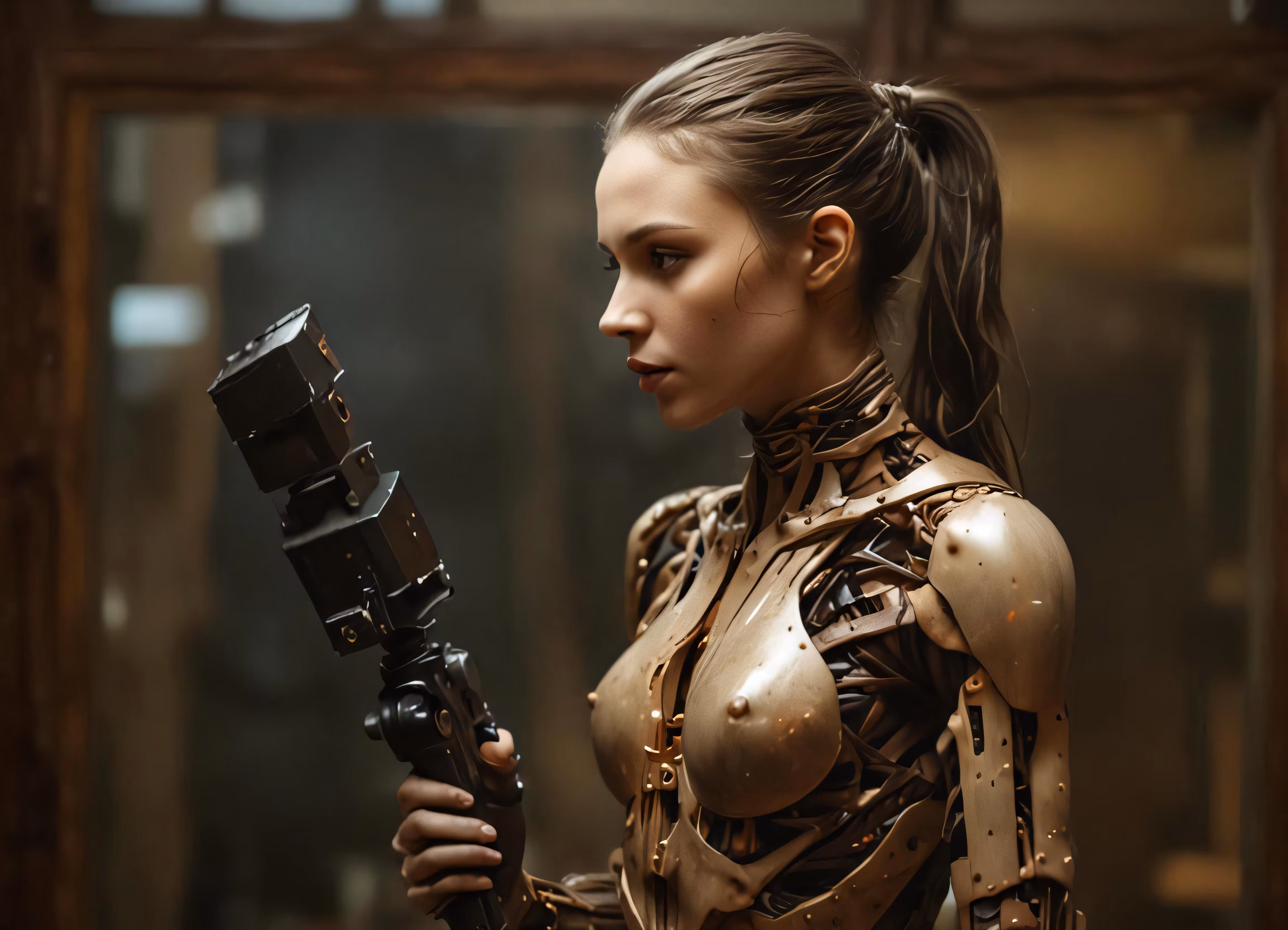 High resolution picture, free to use, woman dressed as robot with arm gun in hand