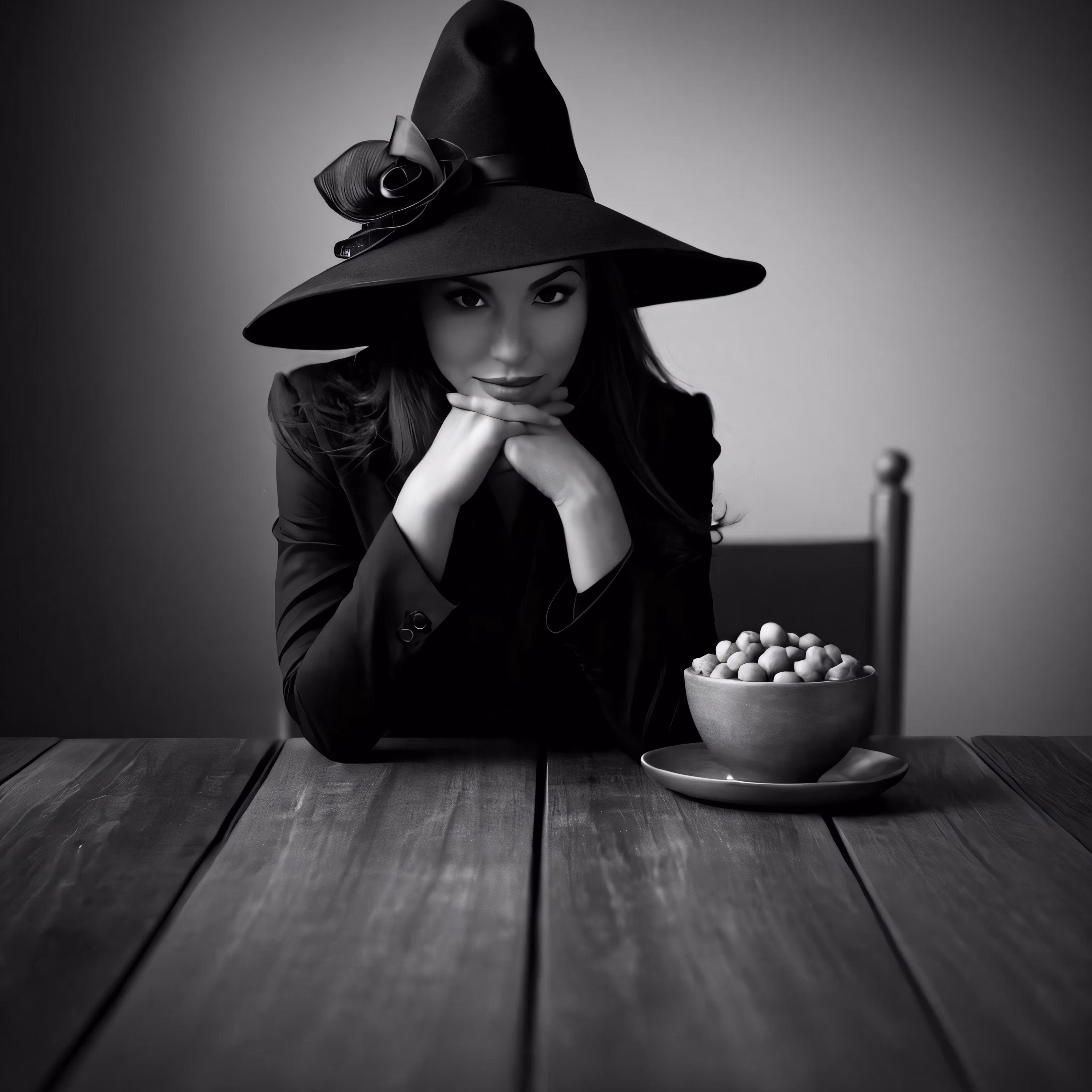 High resolution picture, free to use, woman dressed in black with hat sitting at table with bowl and plate