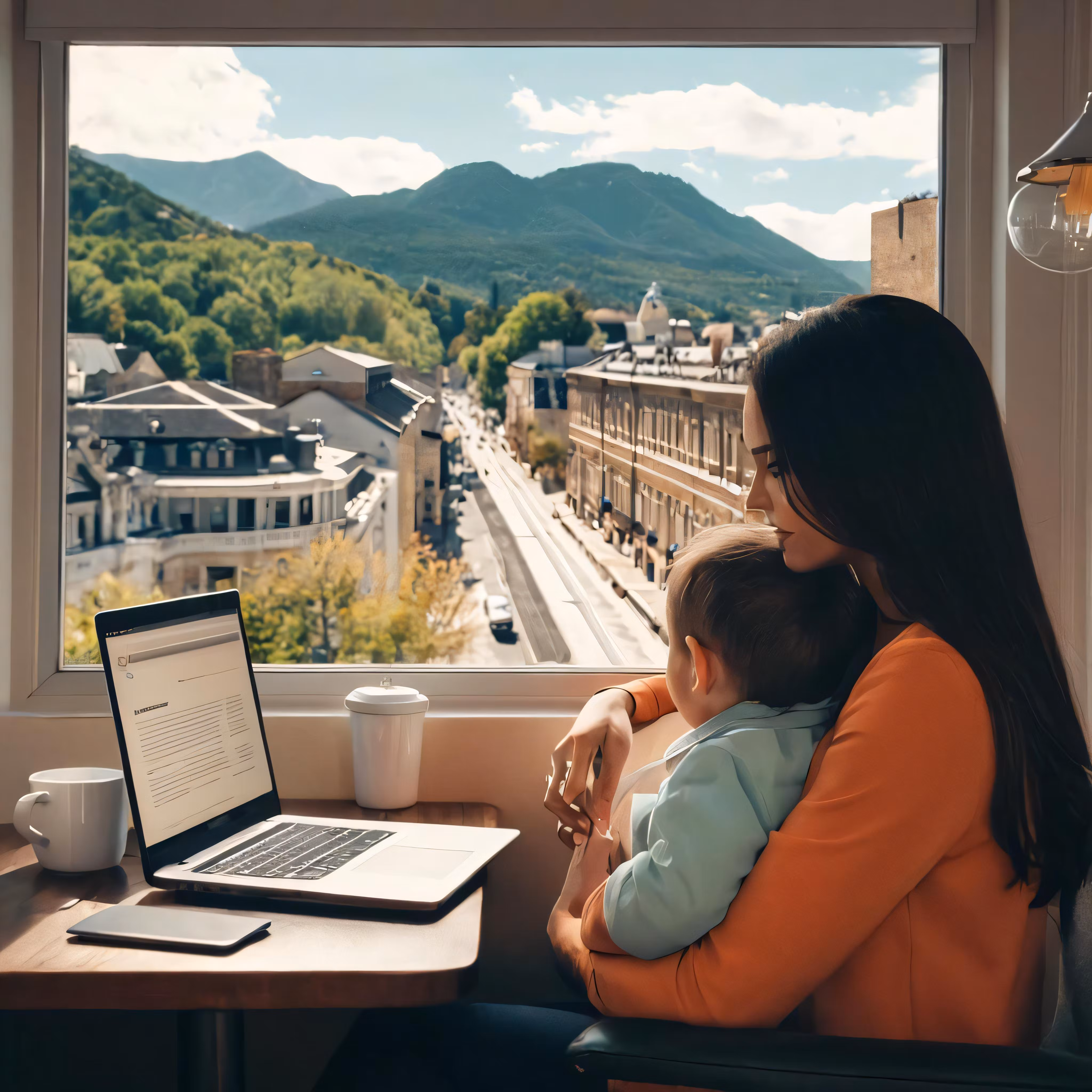 High resolution picture, free to use, woman holding small child using a laptop computer