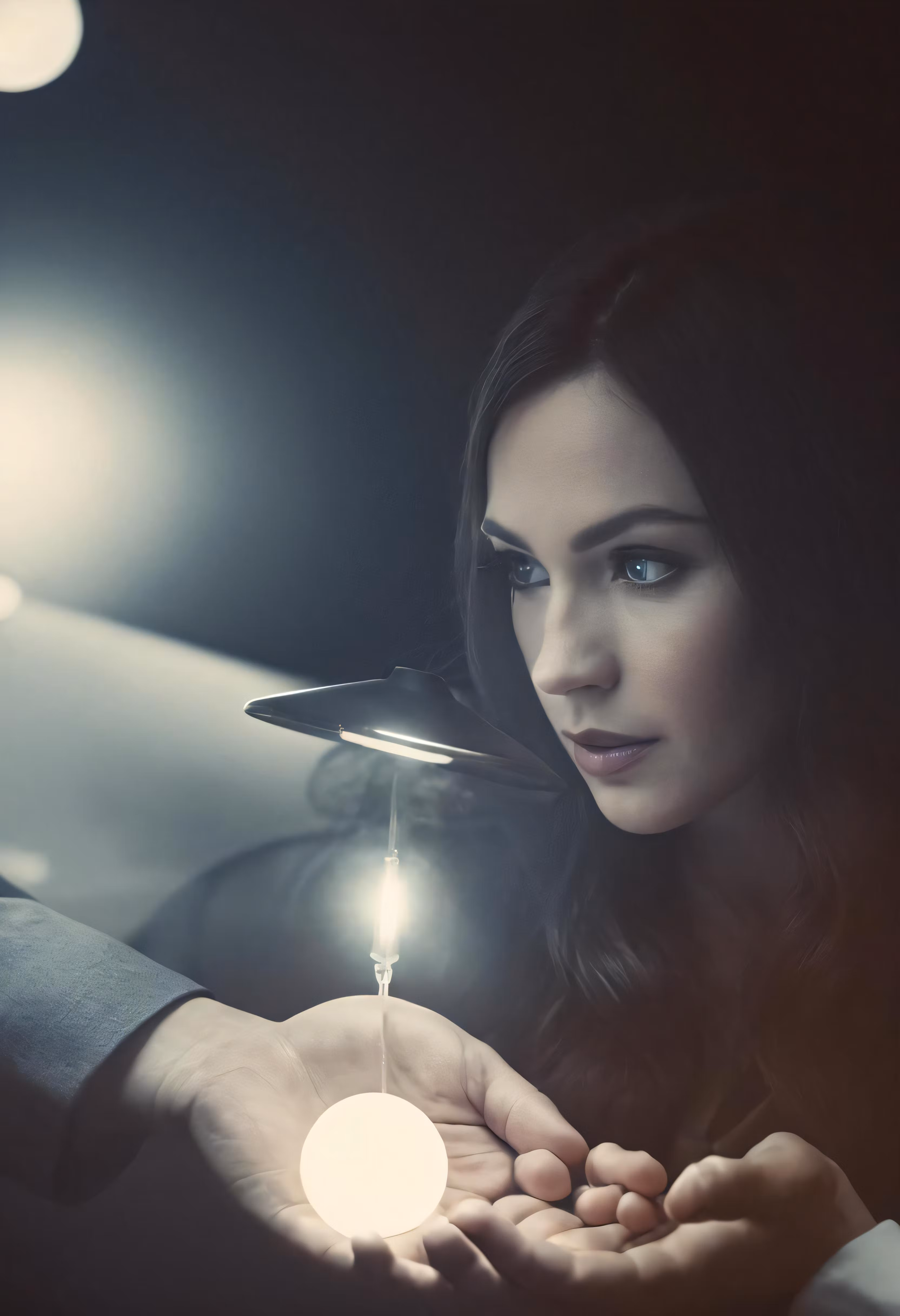 High resolution picture, free to use, woman holding small light bulb being held by man