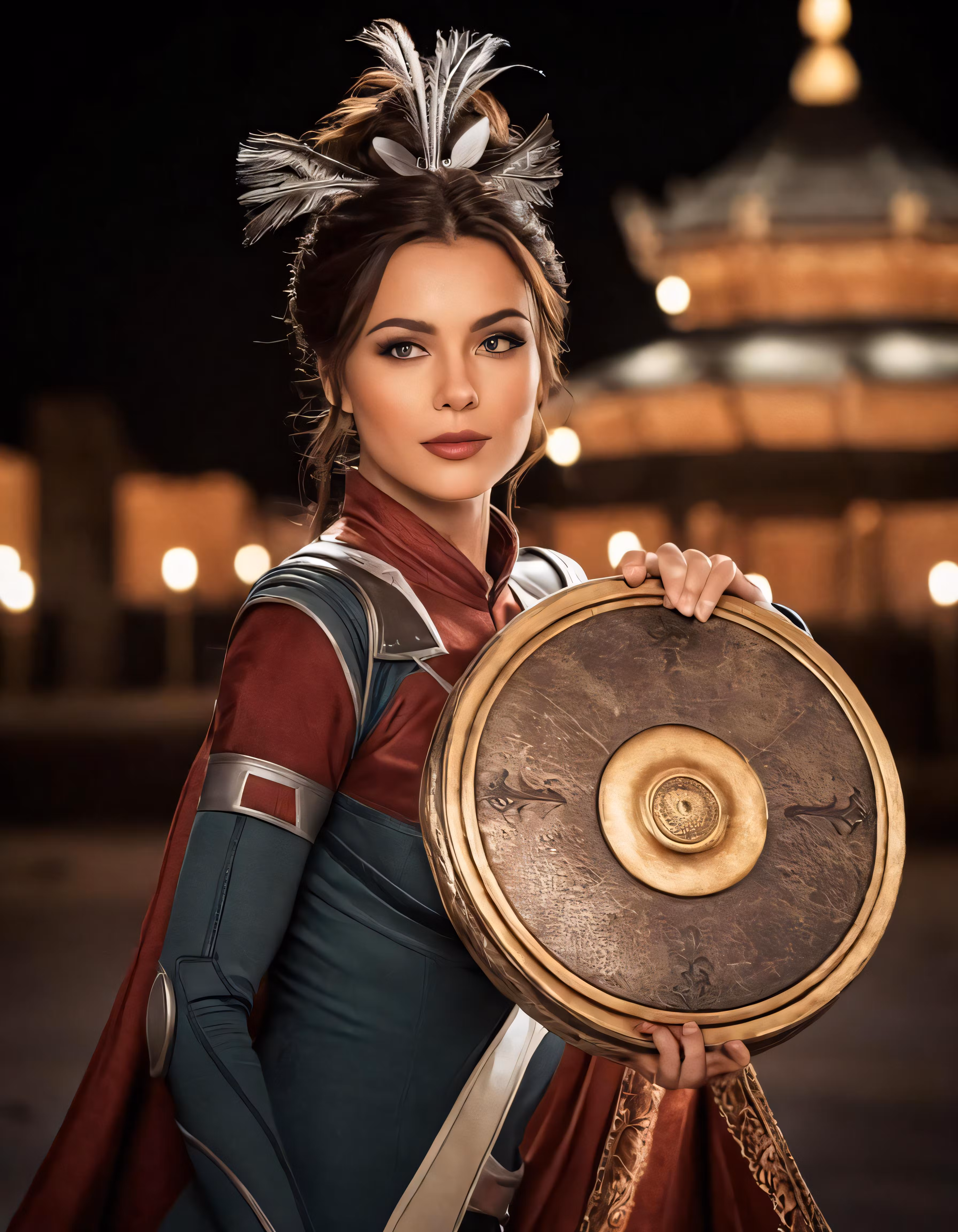 High resolution picture, free to use, woman holding up a large metal plate in front of a building