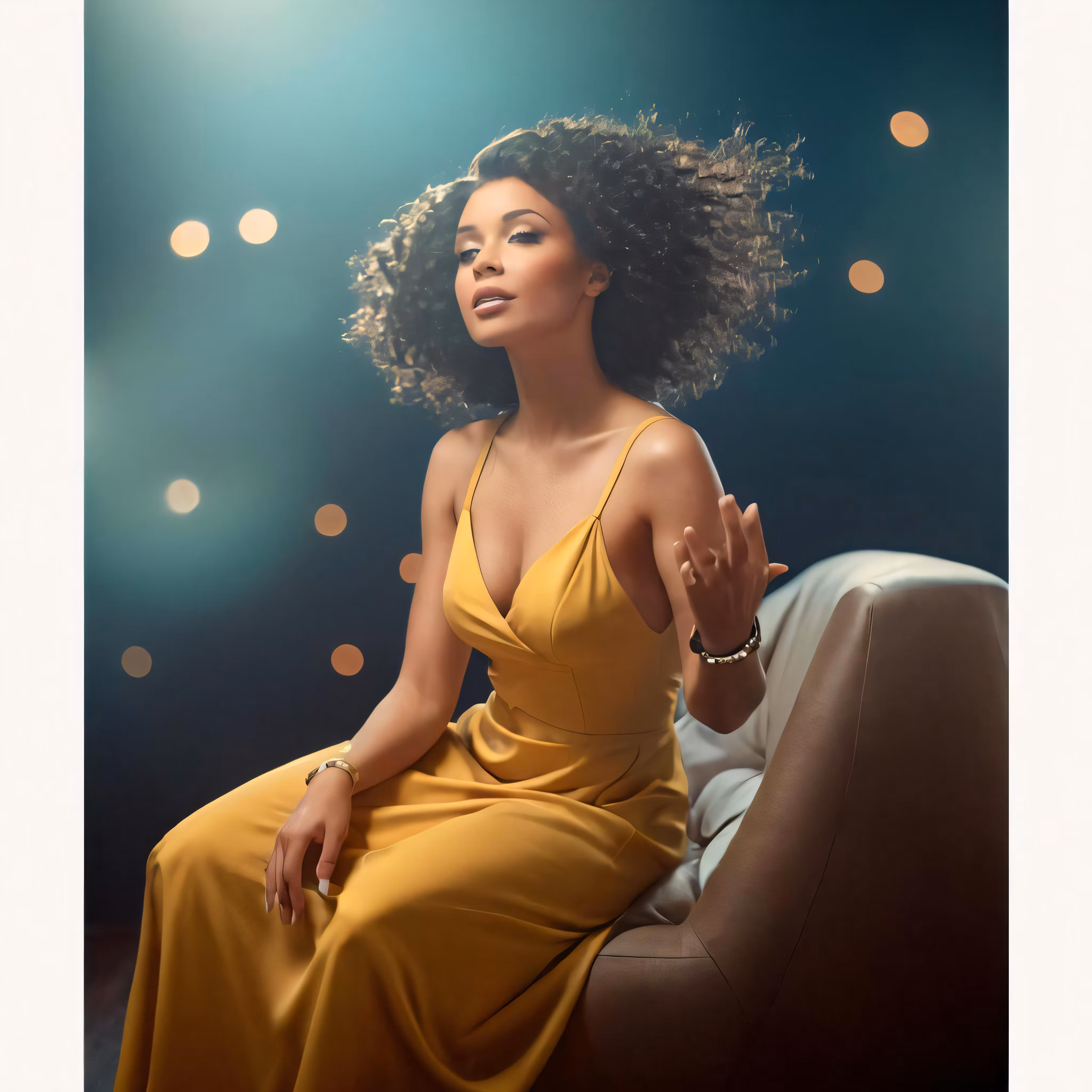 High resolution picture, free to use, woman in a gold dress sitting in chair with her hands on her hips