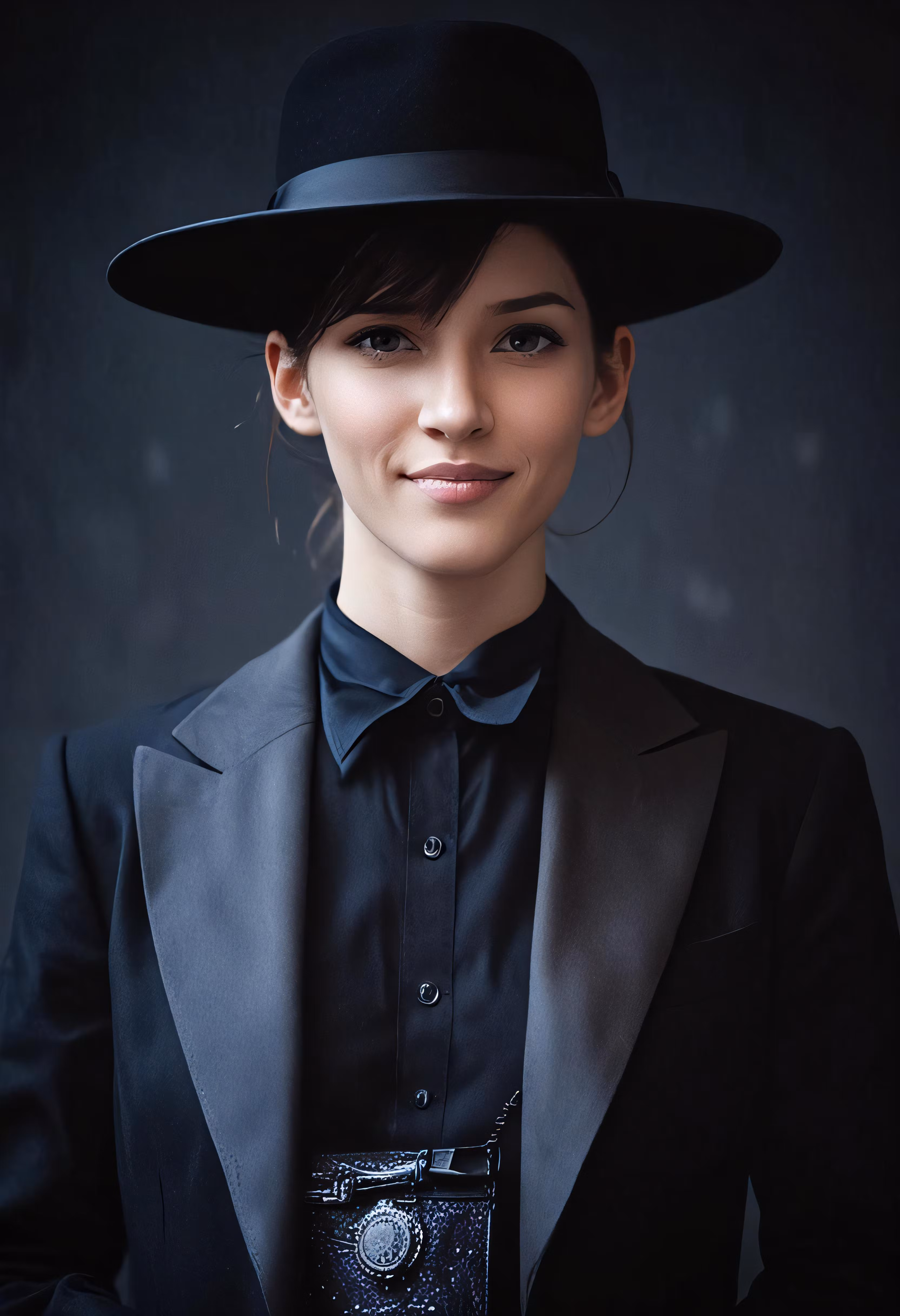 High resolution picture, free to use, woman in black outfit and hat holding camera