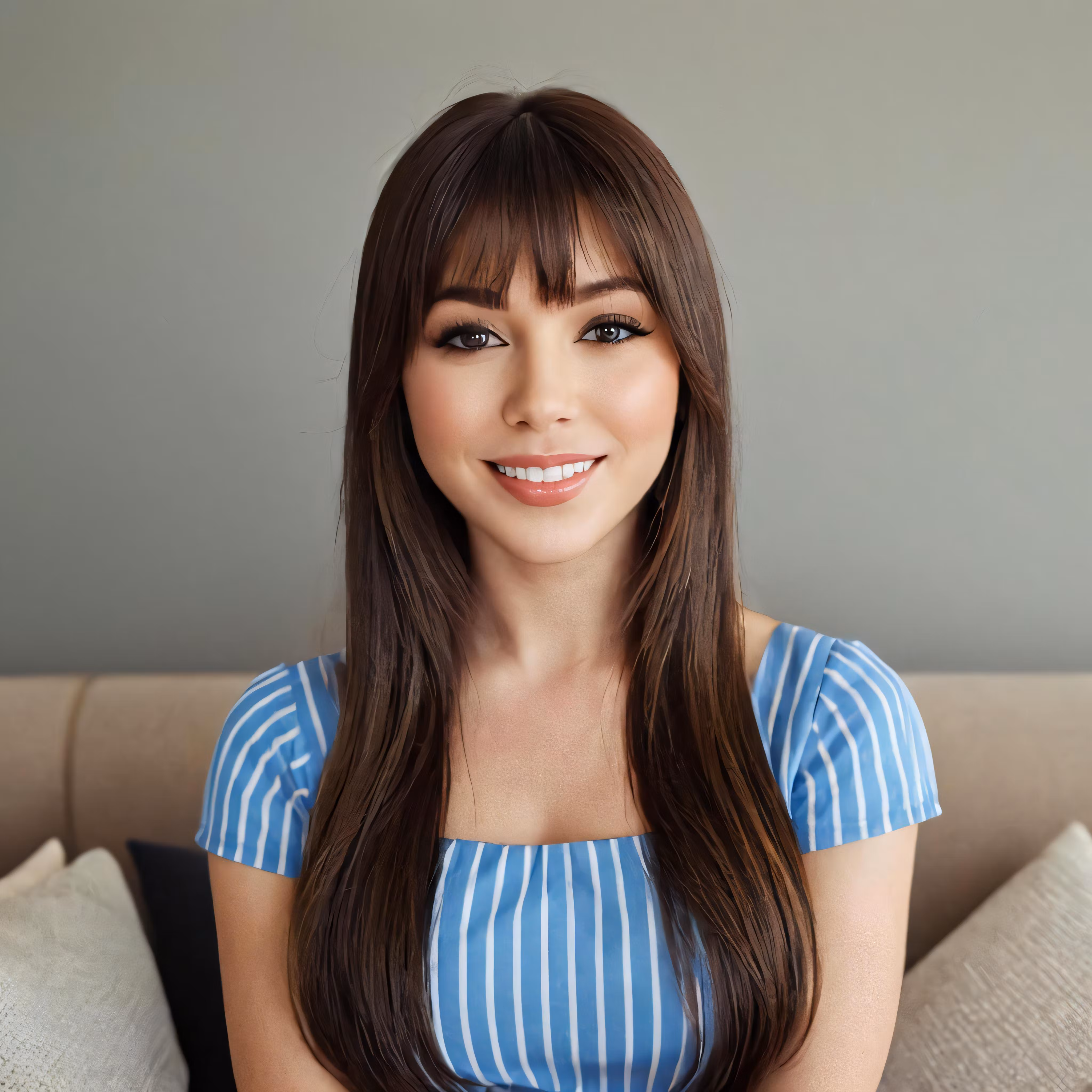 High resolution picture, free to use, woman in blue shirt sitting on sofa smiling