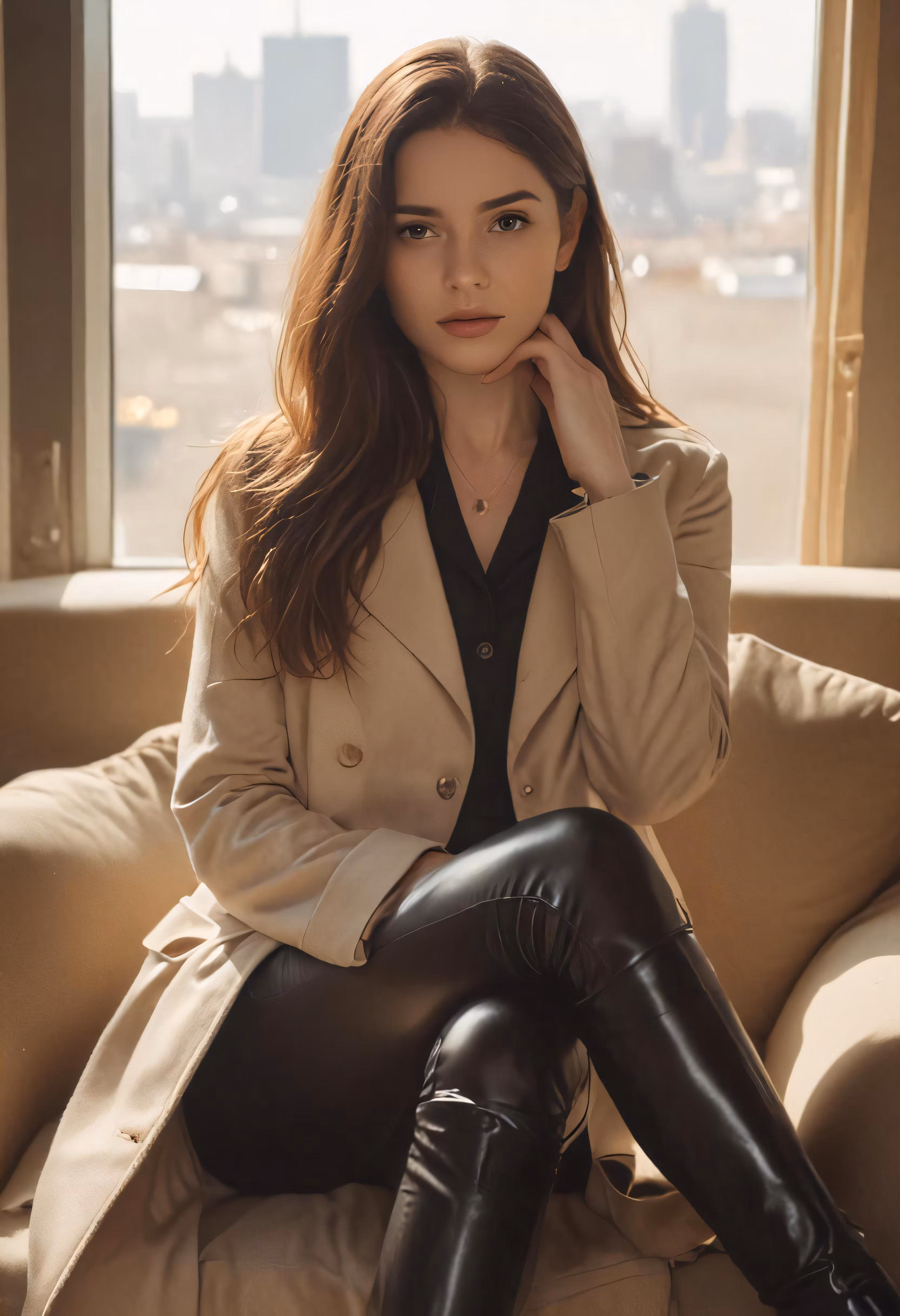 High resolution picture, free to use, woman in brown trench coat sitting on a couch