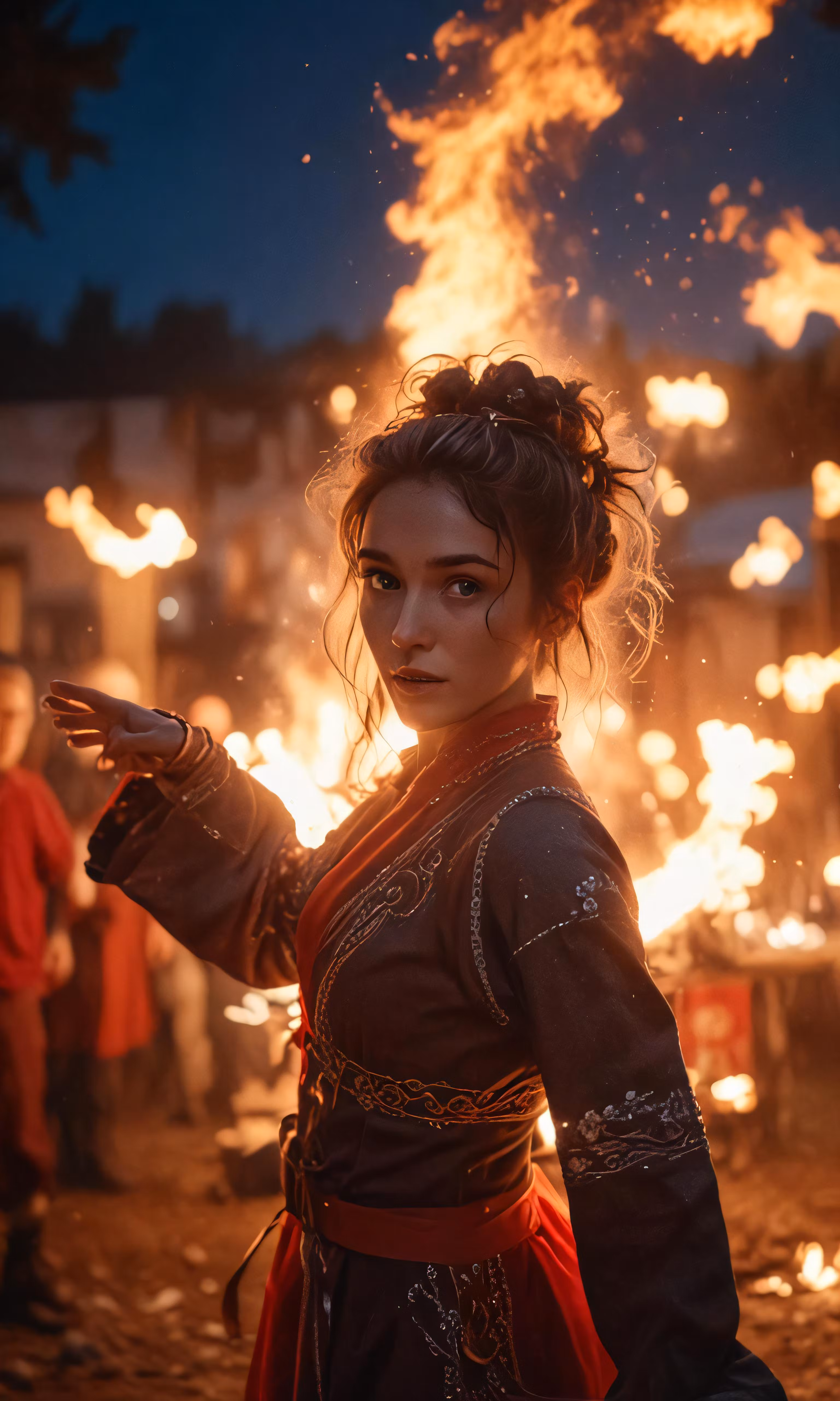 High resolution picture, free to use, woman in costume standing at fire and throwing sparks