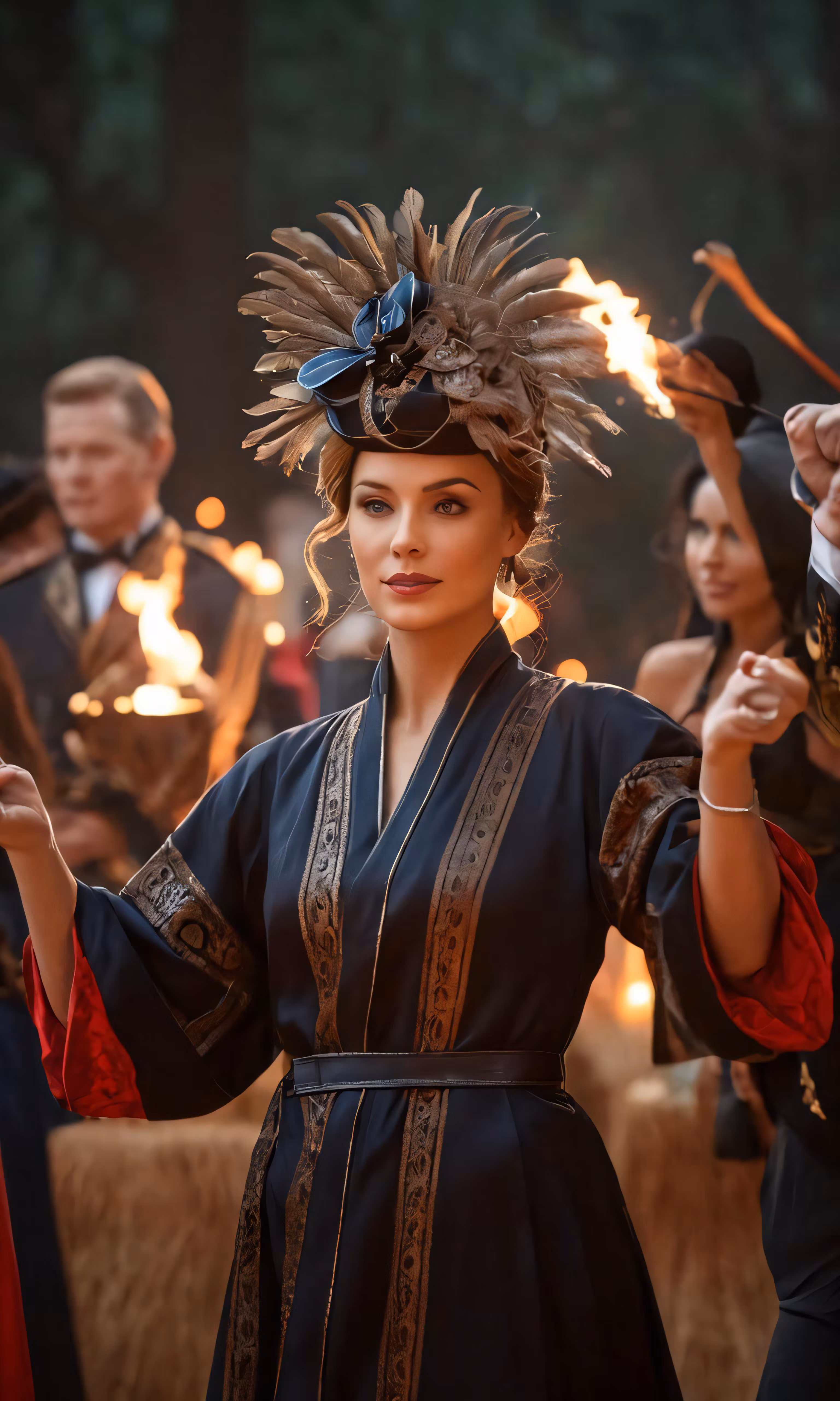 High resolution picture, free to use, woman in dark oriental costume with torches at dinner party