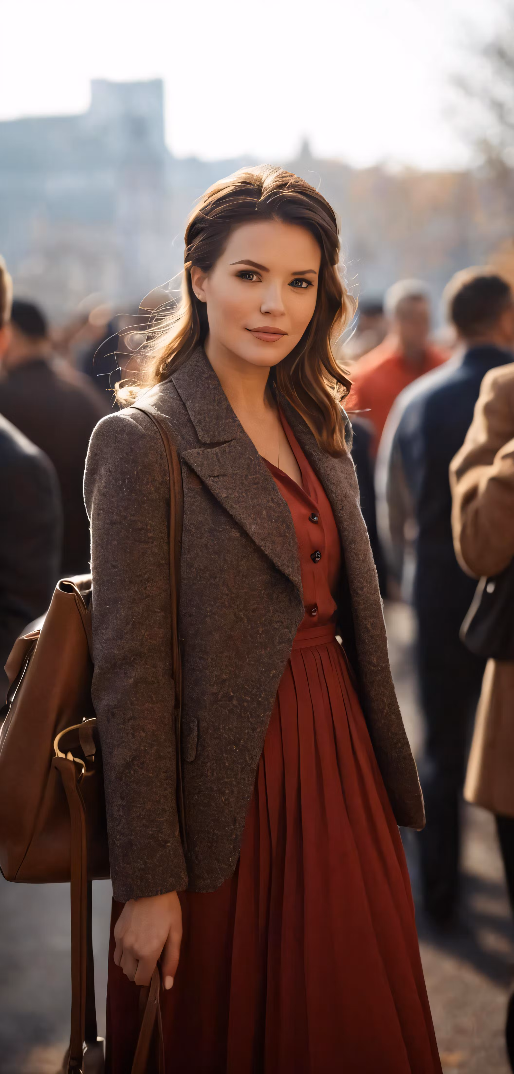 High resolution picture, free to use, woman in dress and coat standing on sidewalk