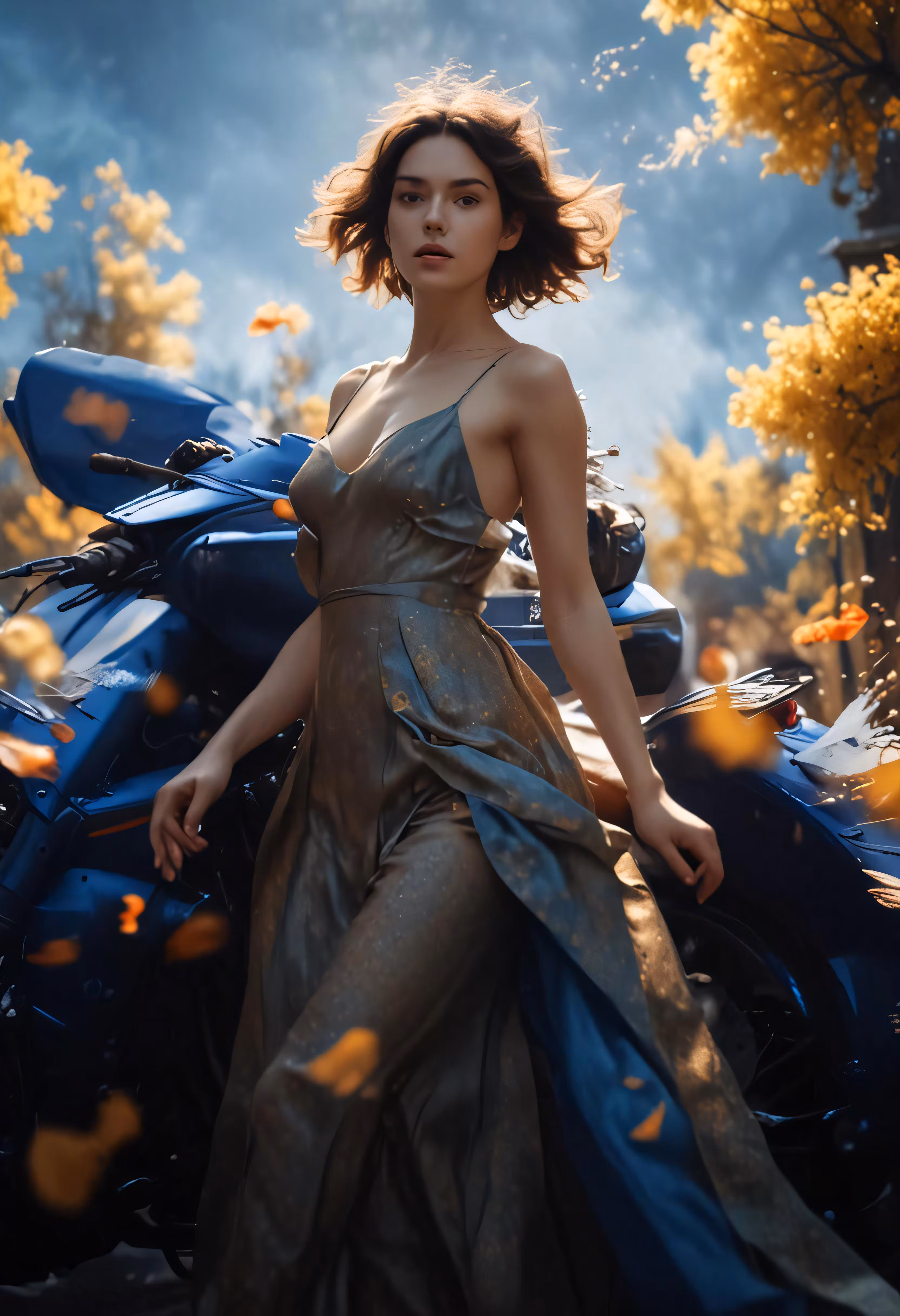 High resolution picture, free to use, woman in dress posing on a motorbike