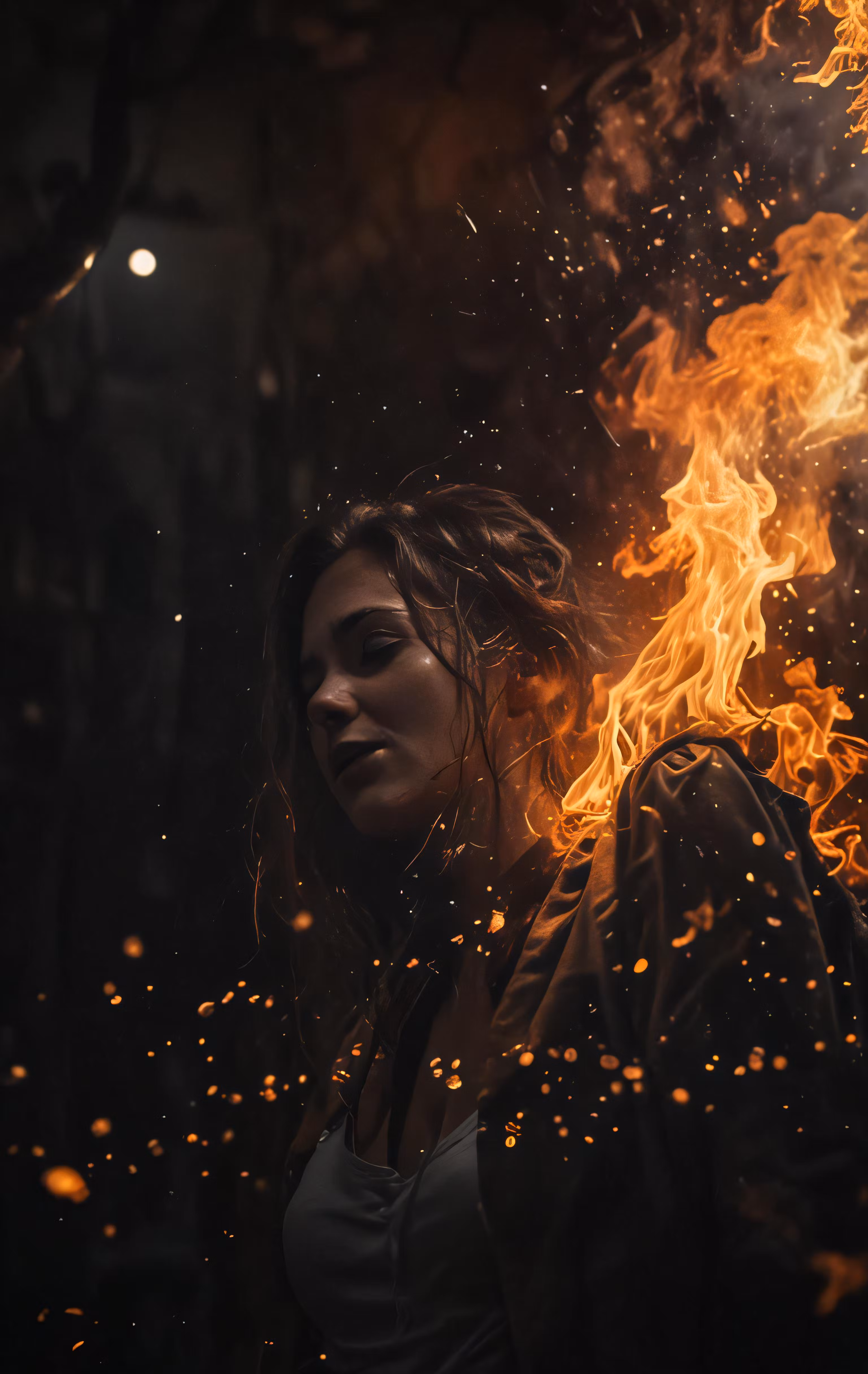 High resolution picture, free to use, woman in fire and black background, face covered by water