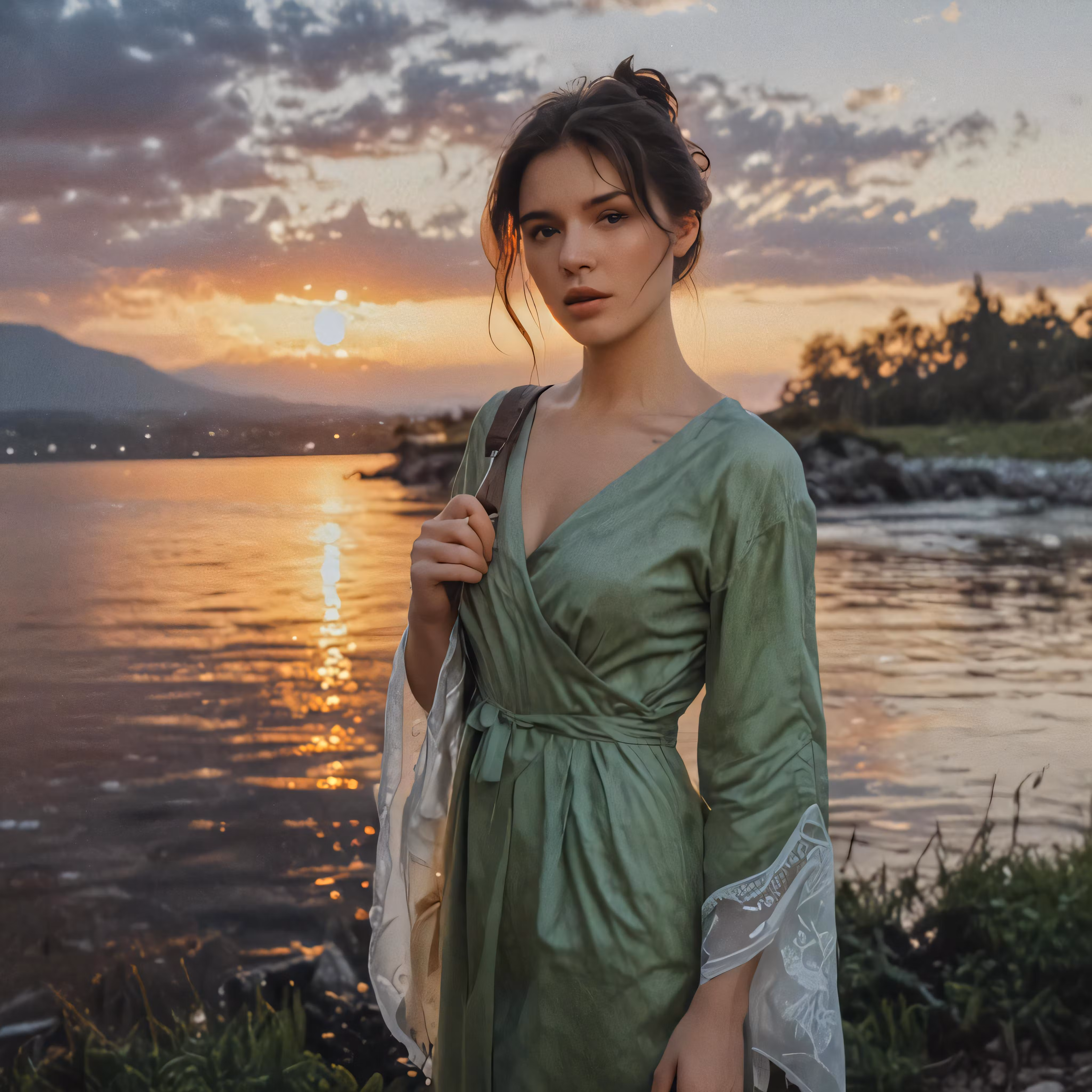 High resolution picture, free to use, woman in green dress standing on the beach by water