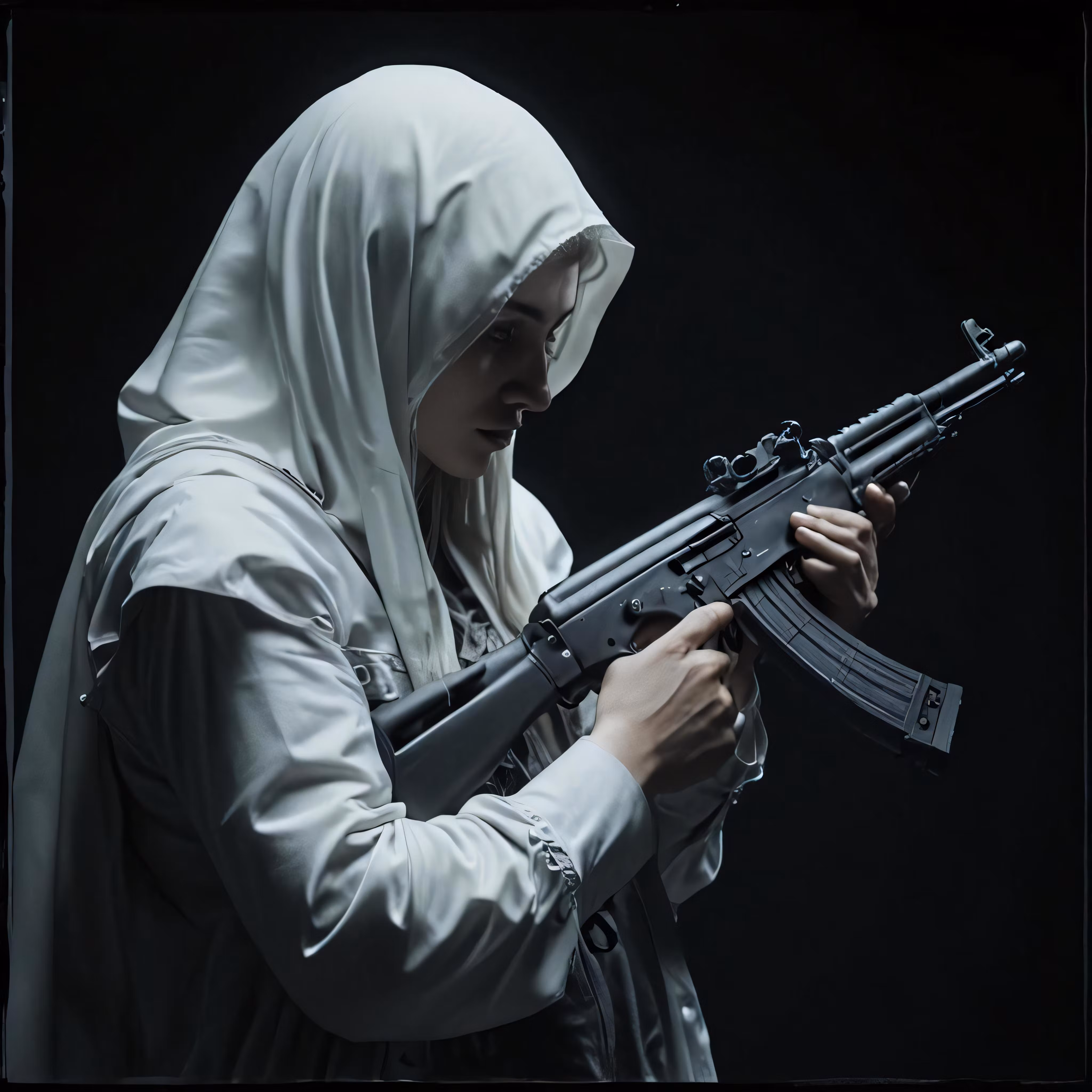 High resolution picture, free to use, woman in hijab holding an ak47 rifle