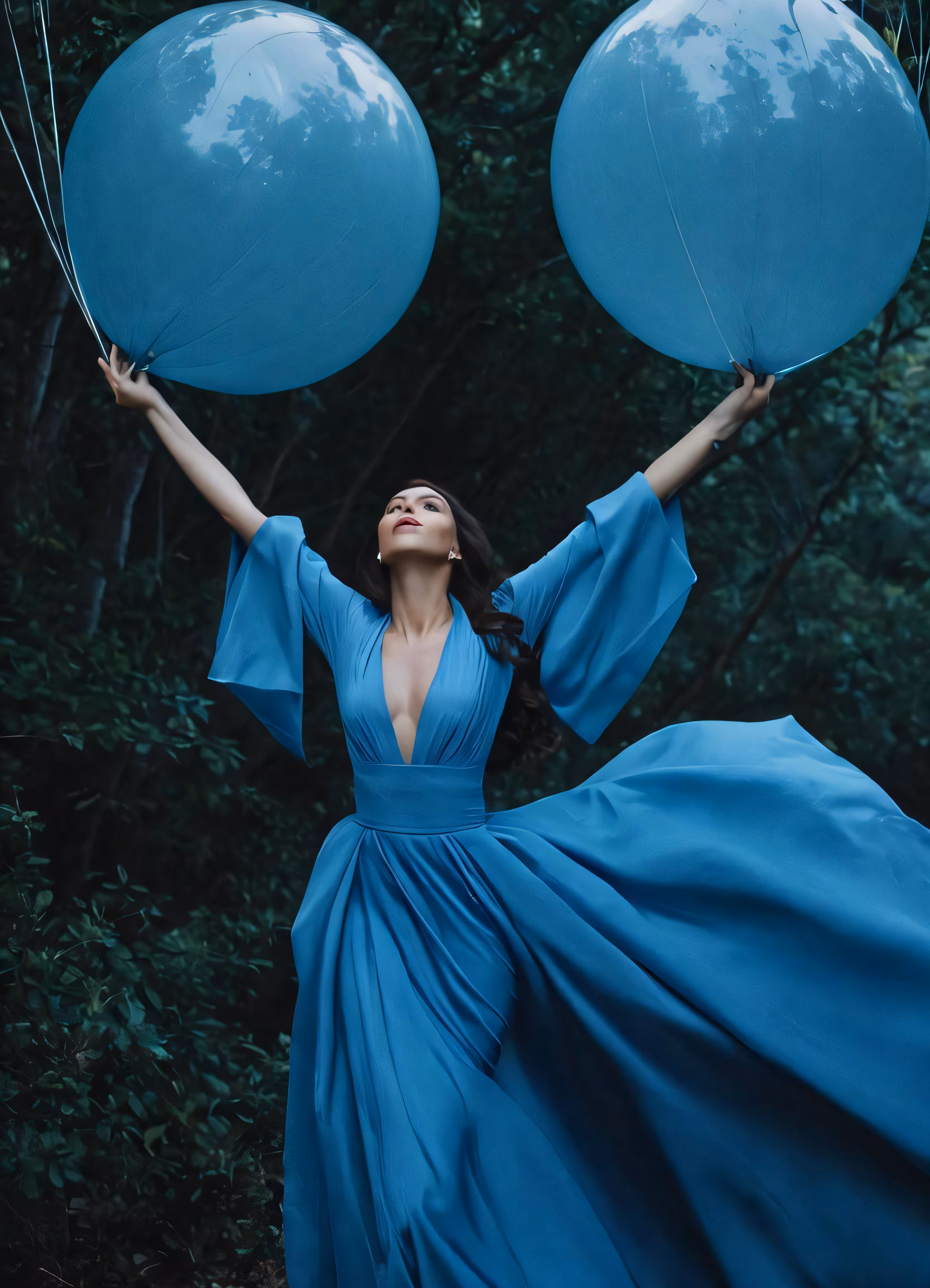 High resolution picture, free to use, woman in long dress carrying balloons to fly in the air
