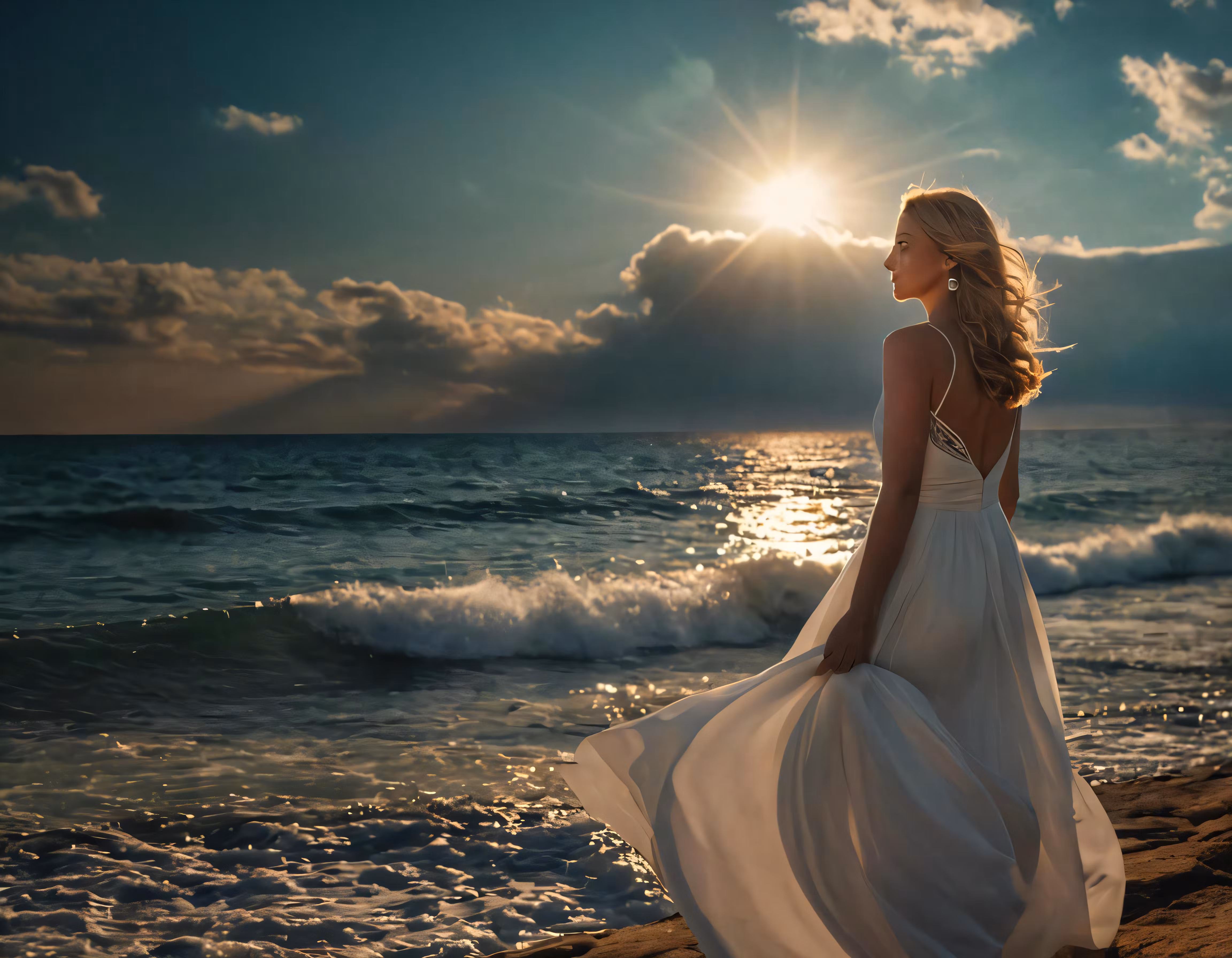 High resolution picture, free to use, woman in long white dress walking along beach during sunset