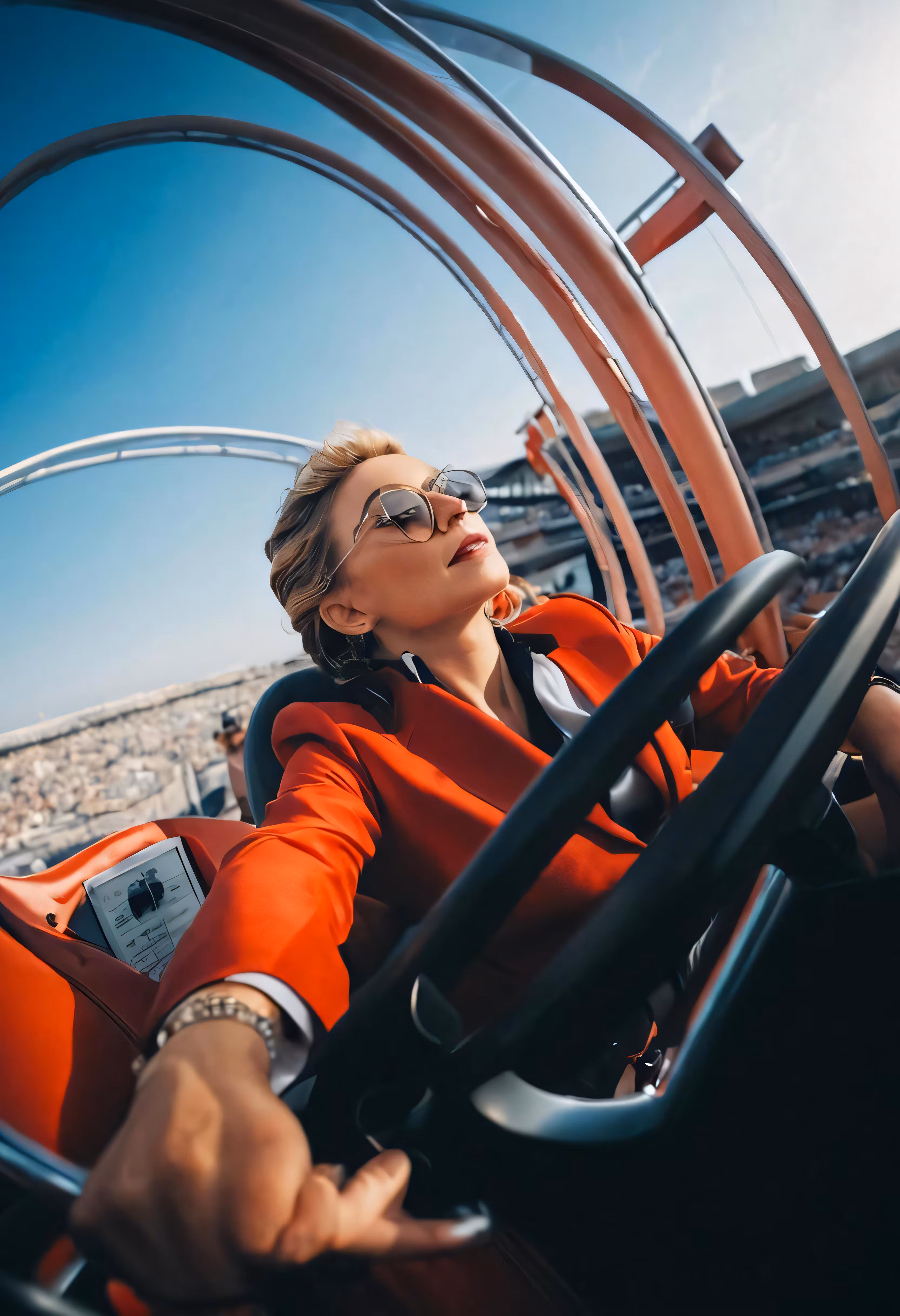 High resolution picture, free to use, woman in orange jacket driving an orange car