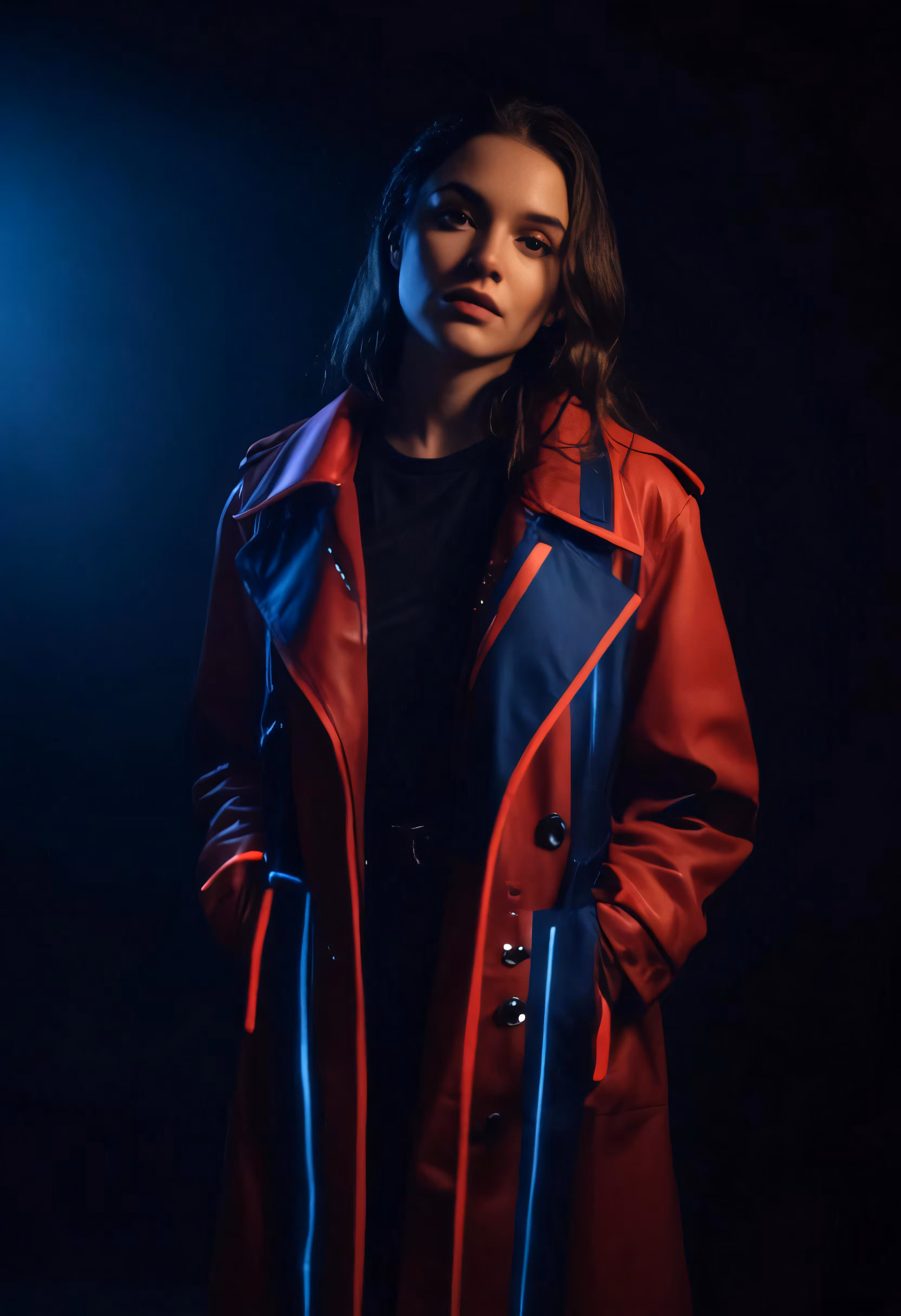 High resolution picture, free to use, woman in red and blue leather coat standing in dark room