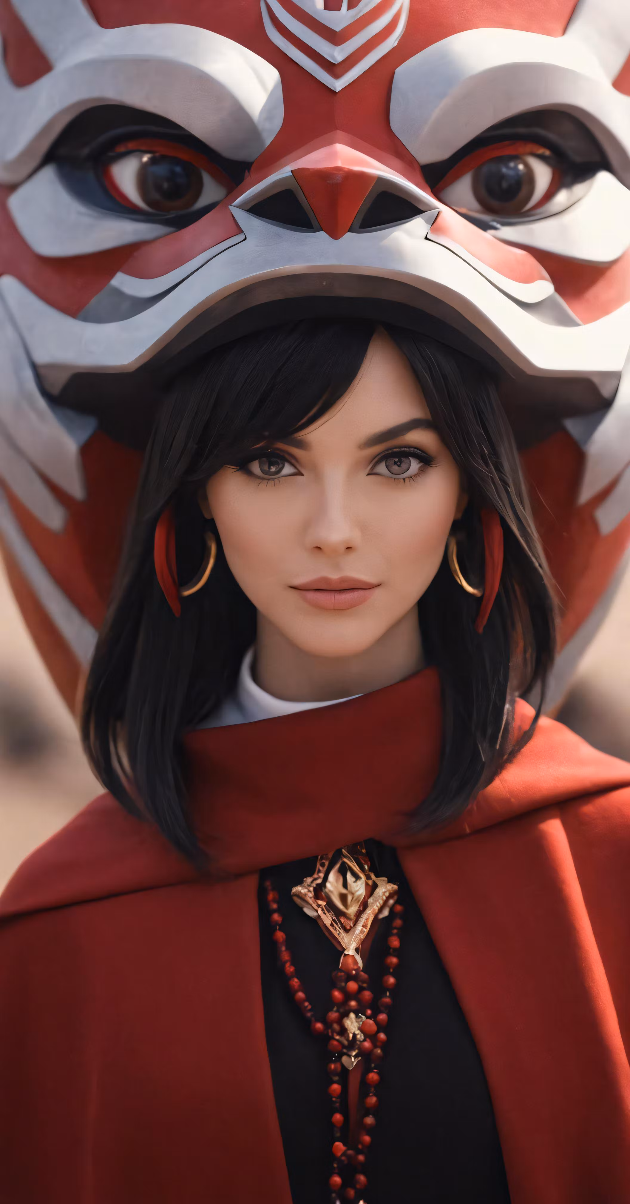 High resolution picture, free to use, woman in red dress with demon mask, jewelry and necklaces