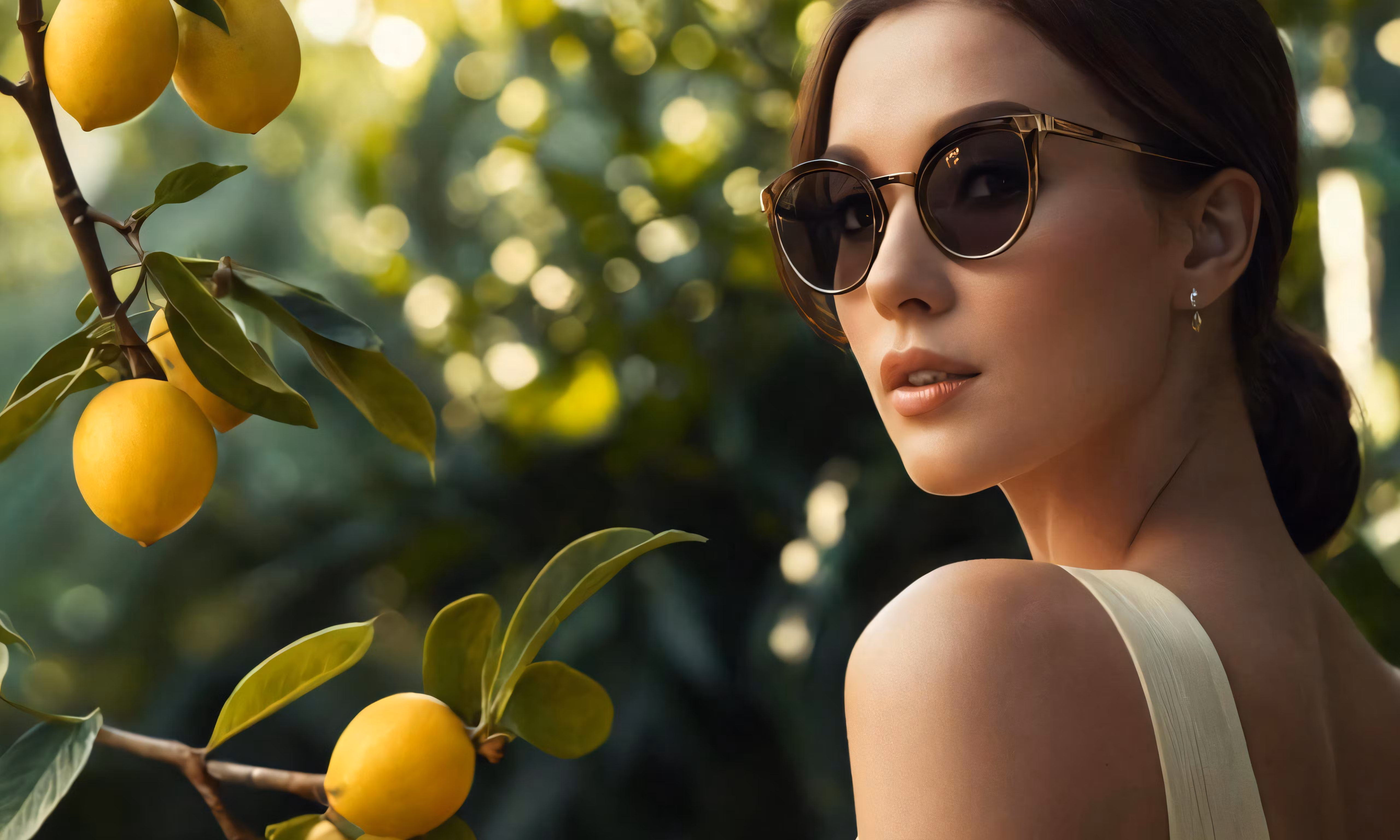 High resolution picture, free to use, woman in sunglasses under lemon tree in sunny sunlight