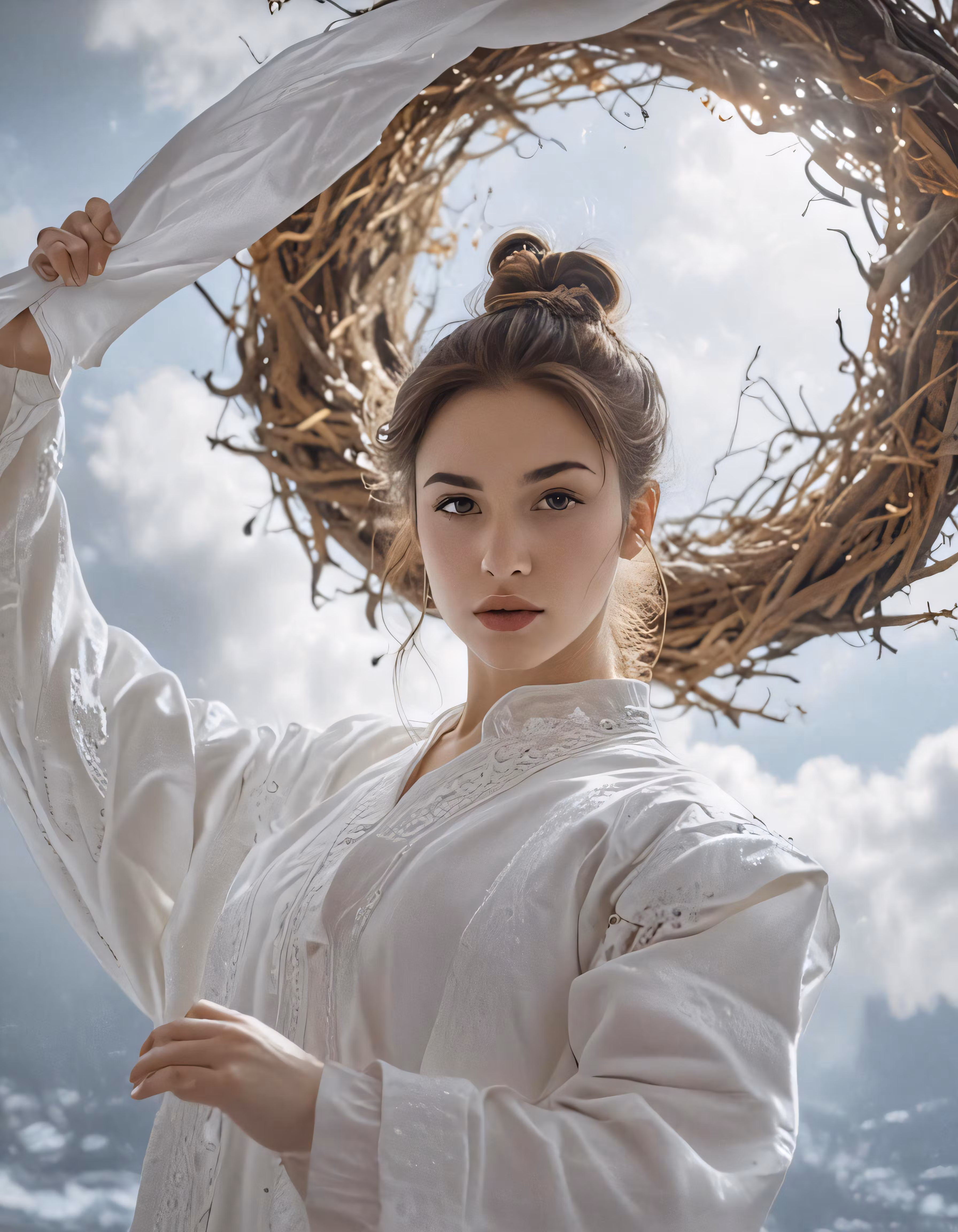 High resolution picture, free to use, woman in white chinese gown and a crown of branches