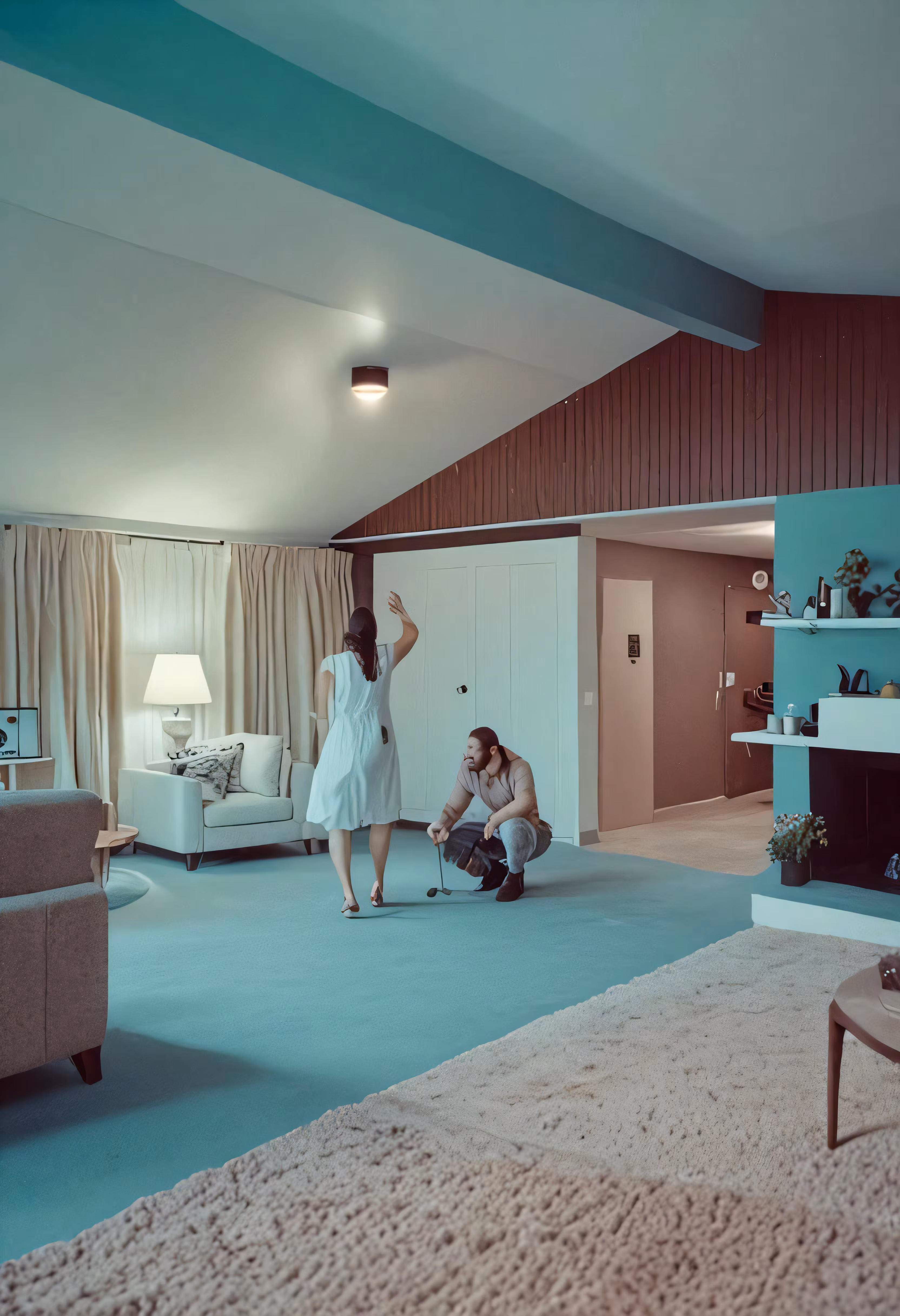 High resolution picture, free to use, woman in white dress and man in pink shoes playing on the floor