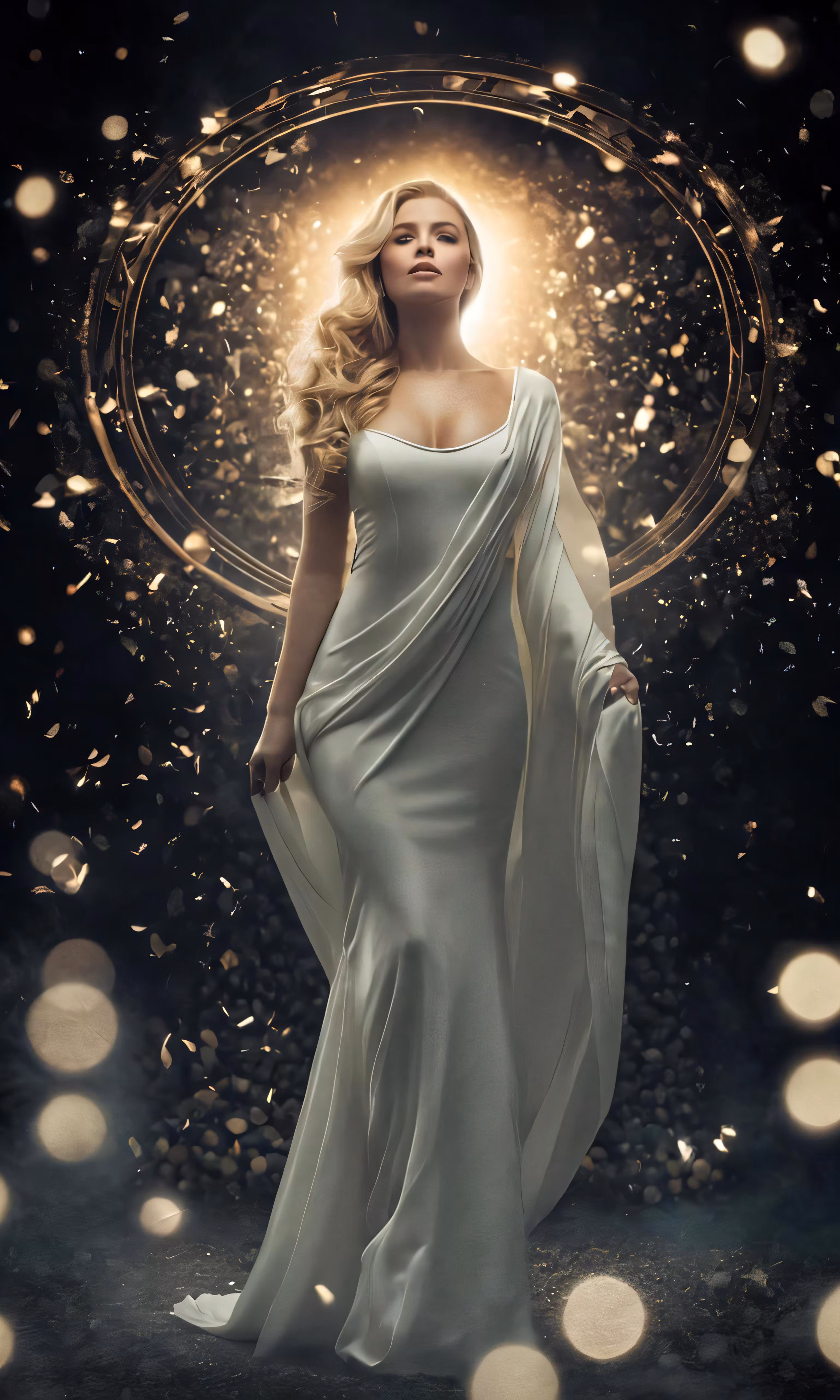 High resolution picture, free to use, woman in white gown with flowing gold dust