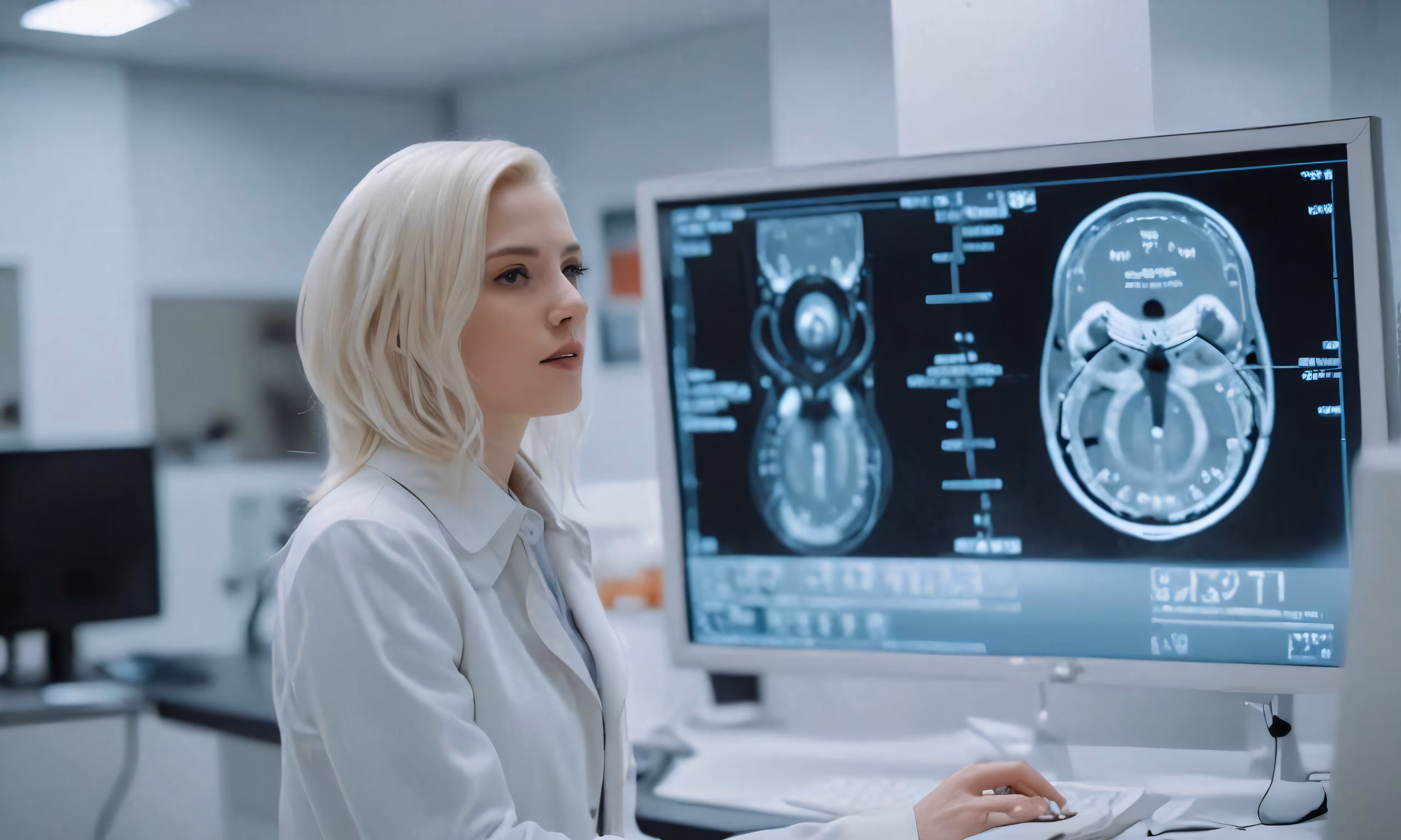 High resolution picture, free to use, woman in white lab coat looking at computer screen