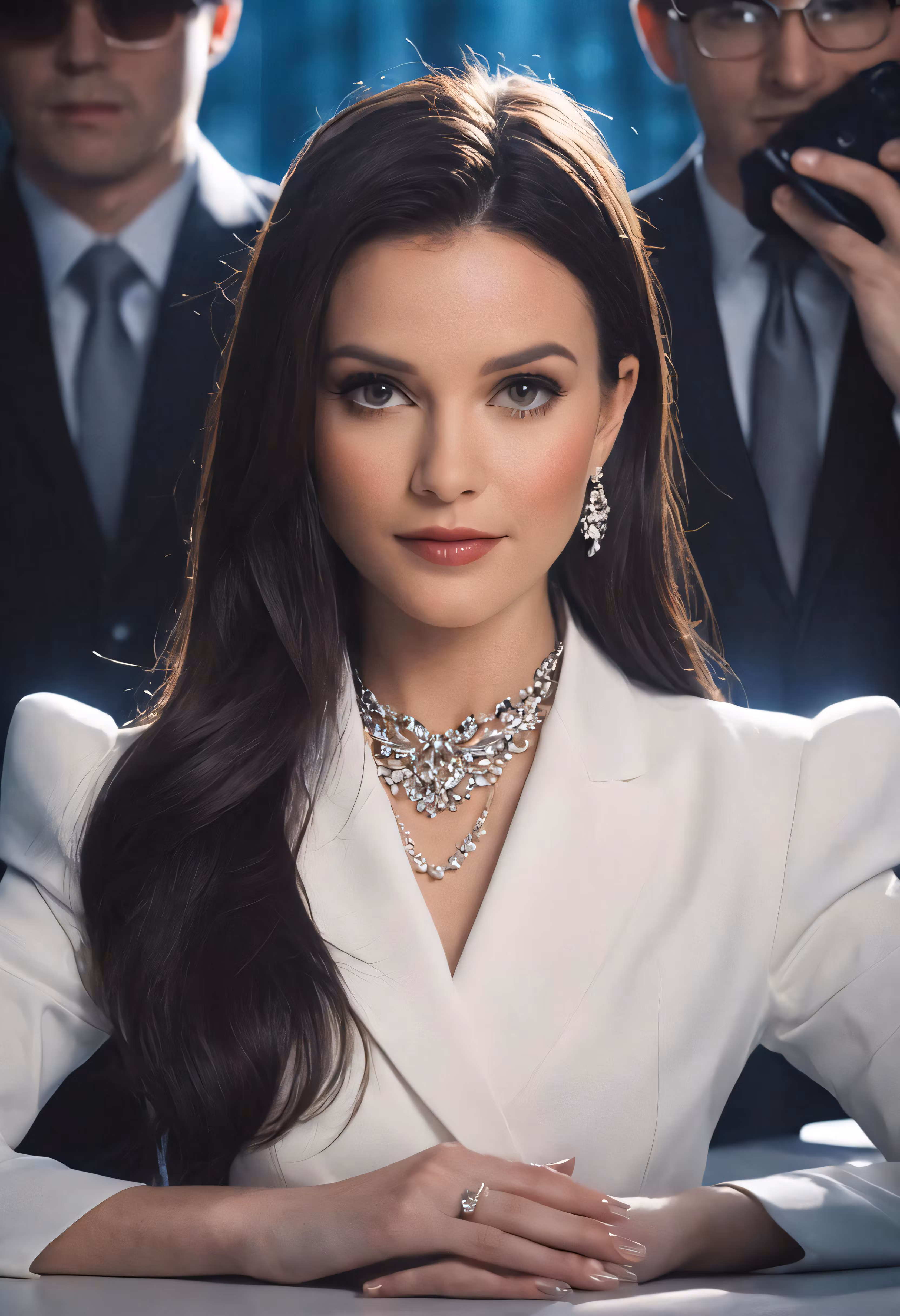 High resolution picture, free to use, woman in white suit with several men behind her wearing glasses