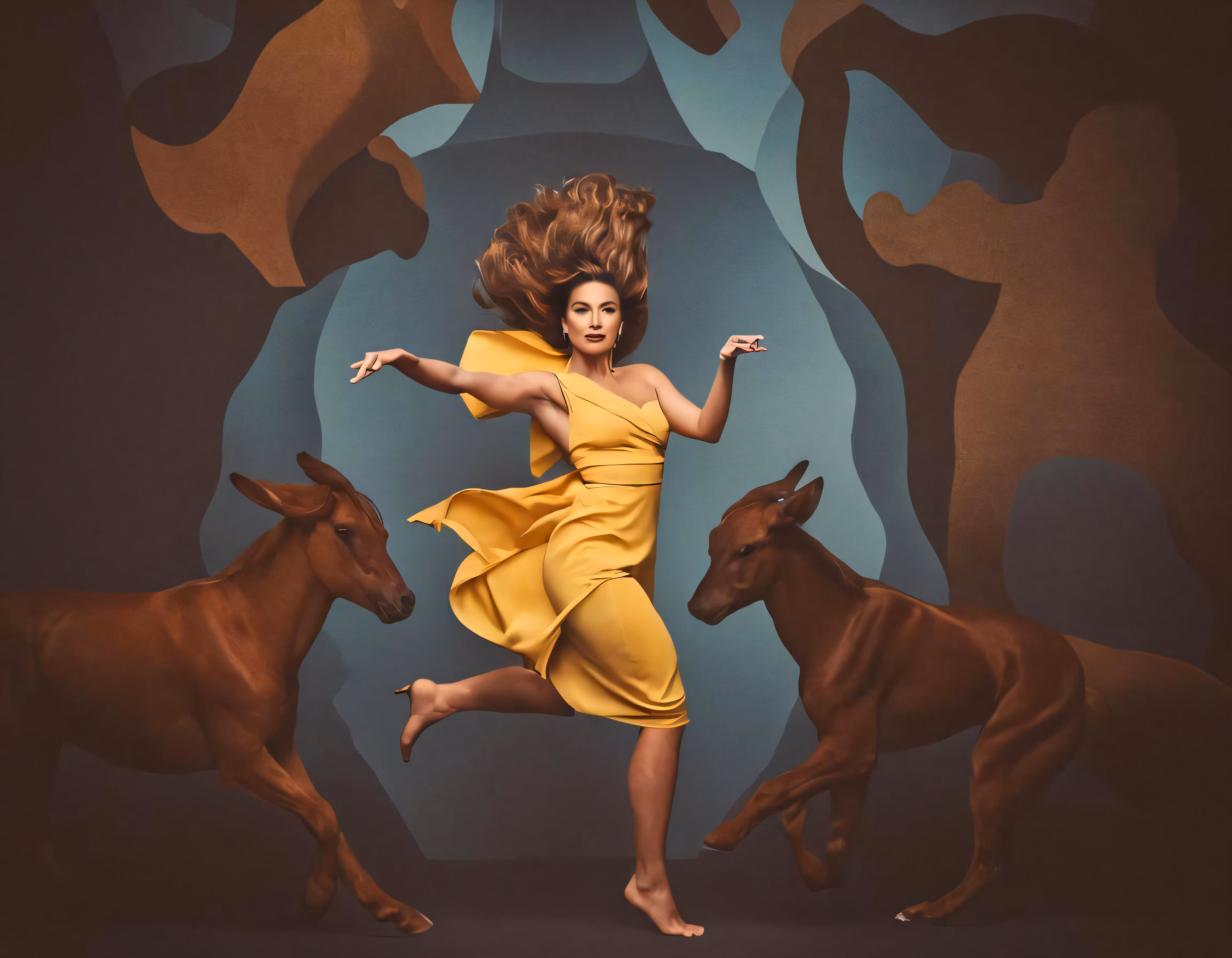 High resolution picture, free to use, woman in yellow dress surrounded by brown cows