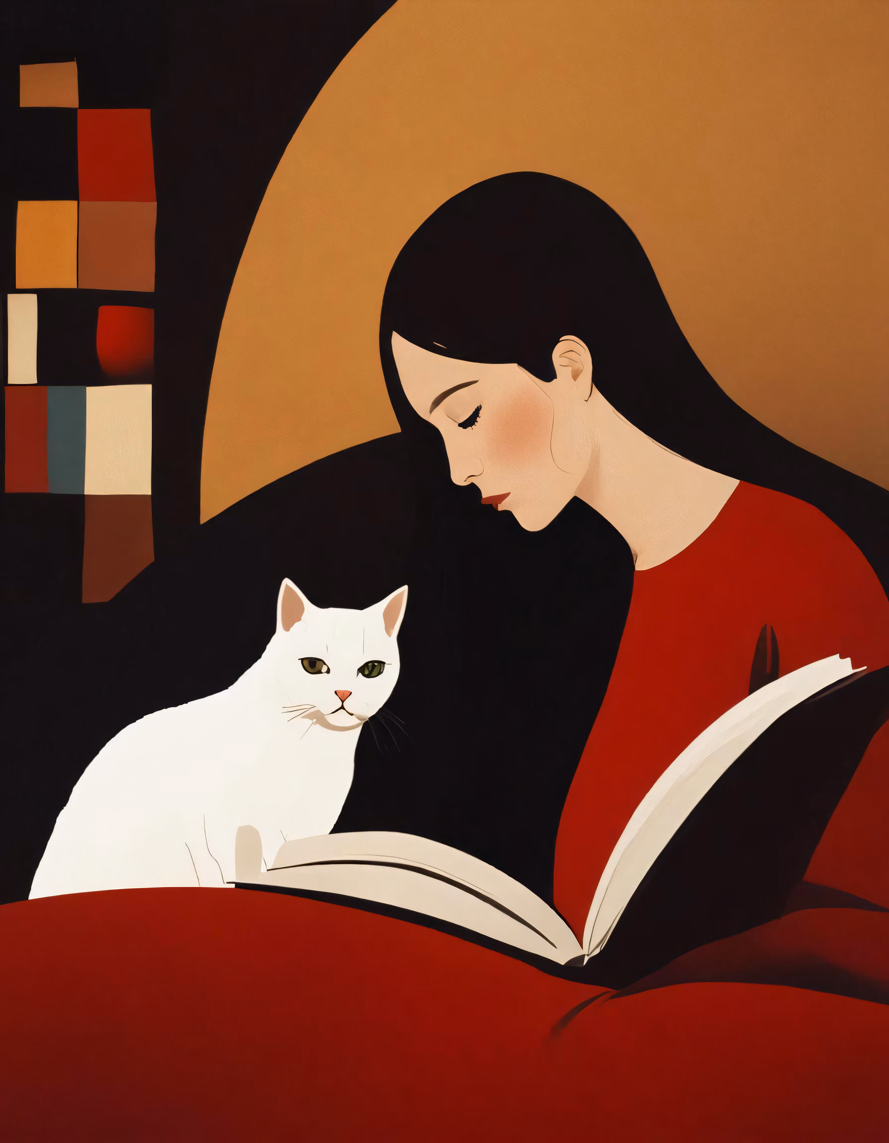 High resolution picture, free to use, woman reading a book with cat sitting on top