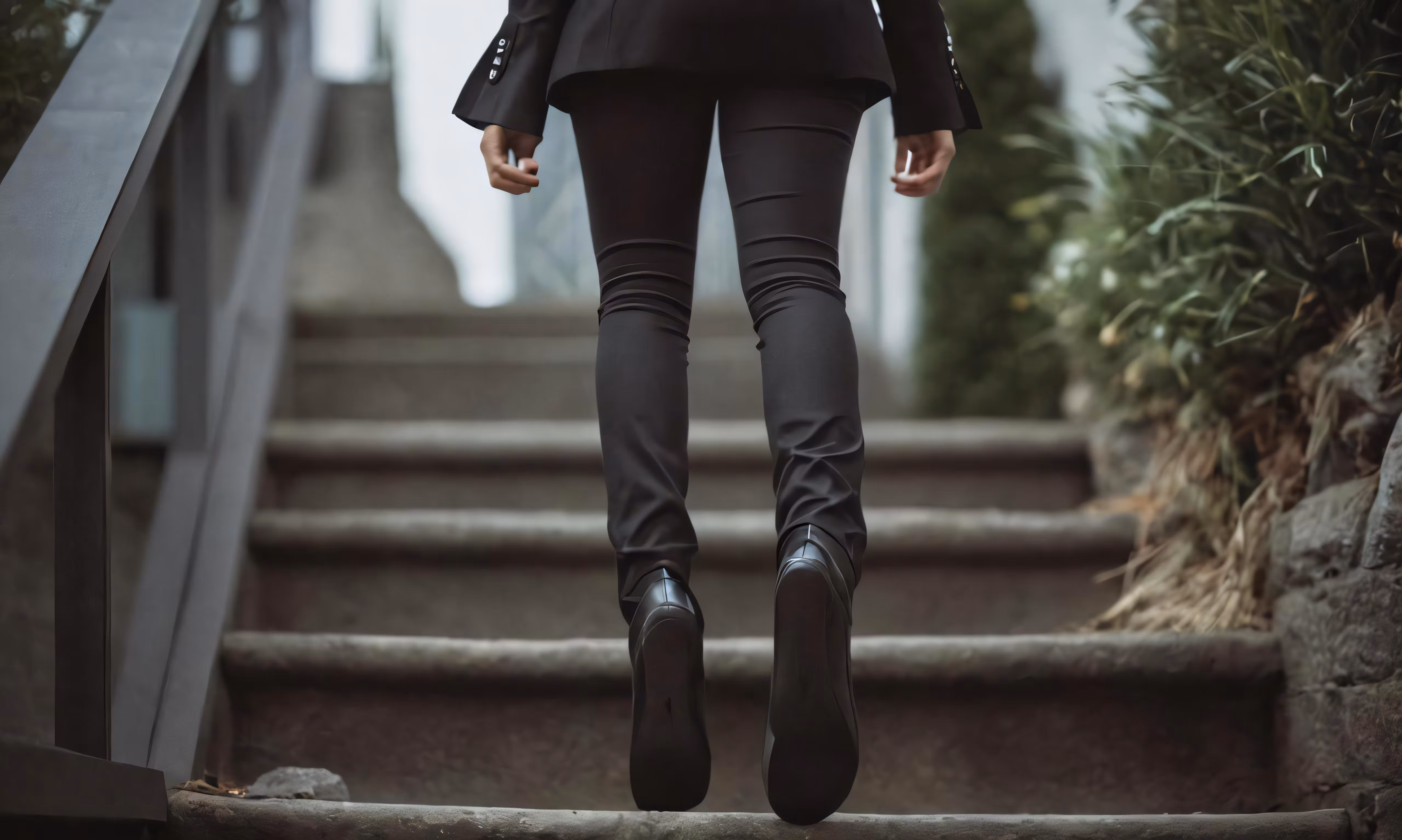High resolution picture, free to use, woman running up some stairs in a dark jacket