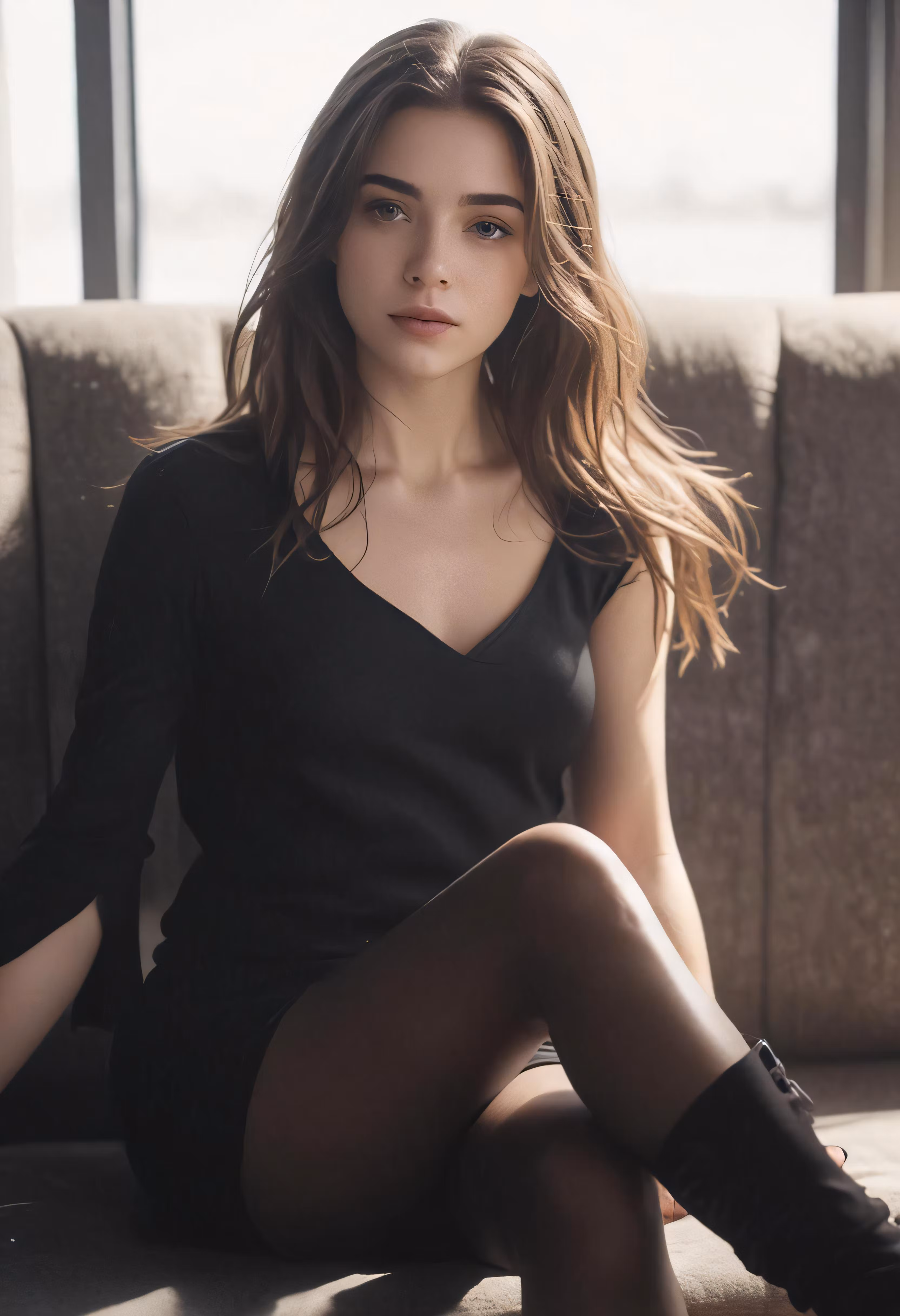 High resolution picture, free to use, woman sitting on a couch in black dress and boots