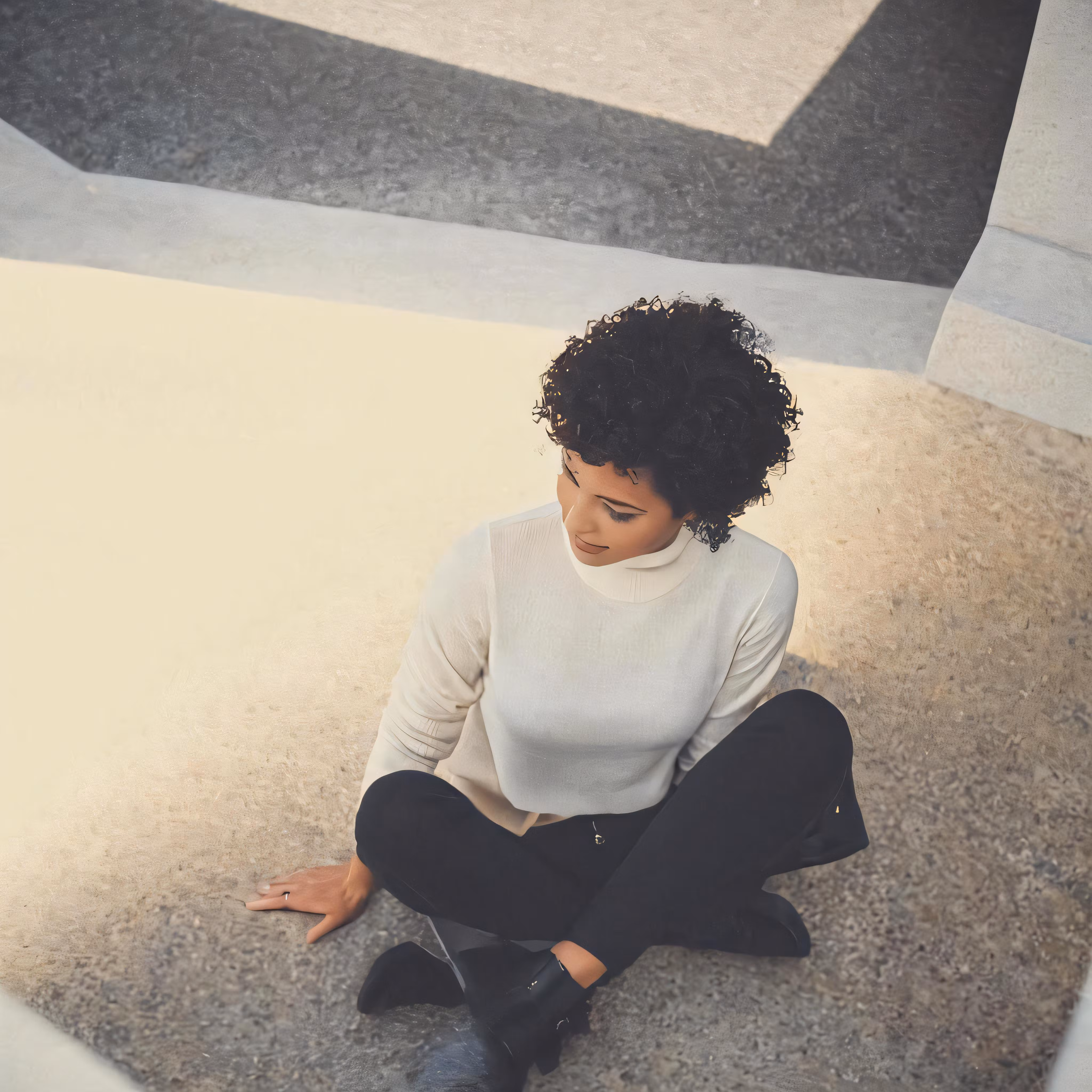 High resolution picture, free to use, woman sitting on concrete with open arms, wearing black pants and a sweater