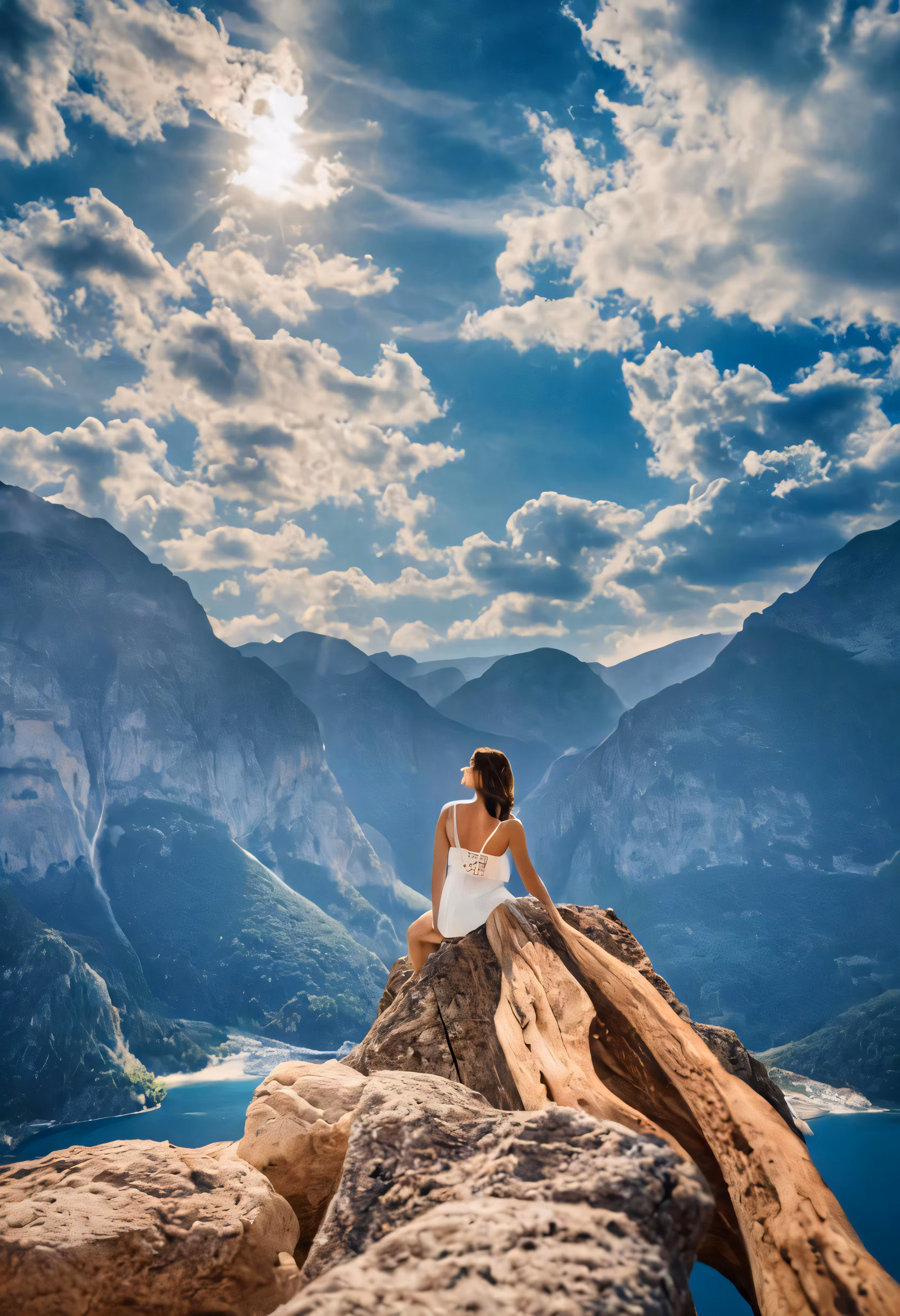 High resolution picture, free to use, woman sitting on the edge of a cliff and looking down