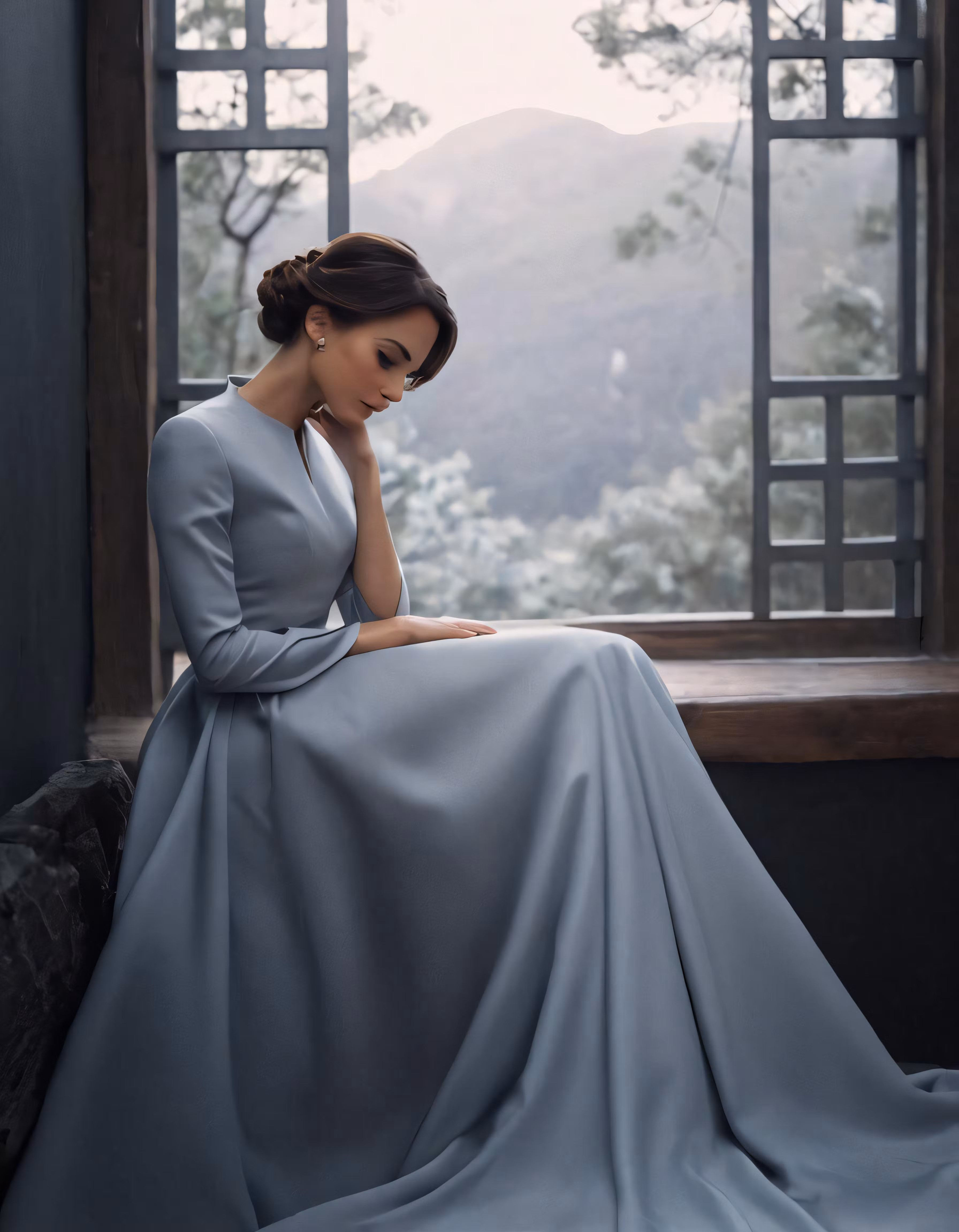 High resolution picture, free to use, woman sitting on windowsill in a blue gown