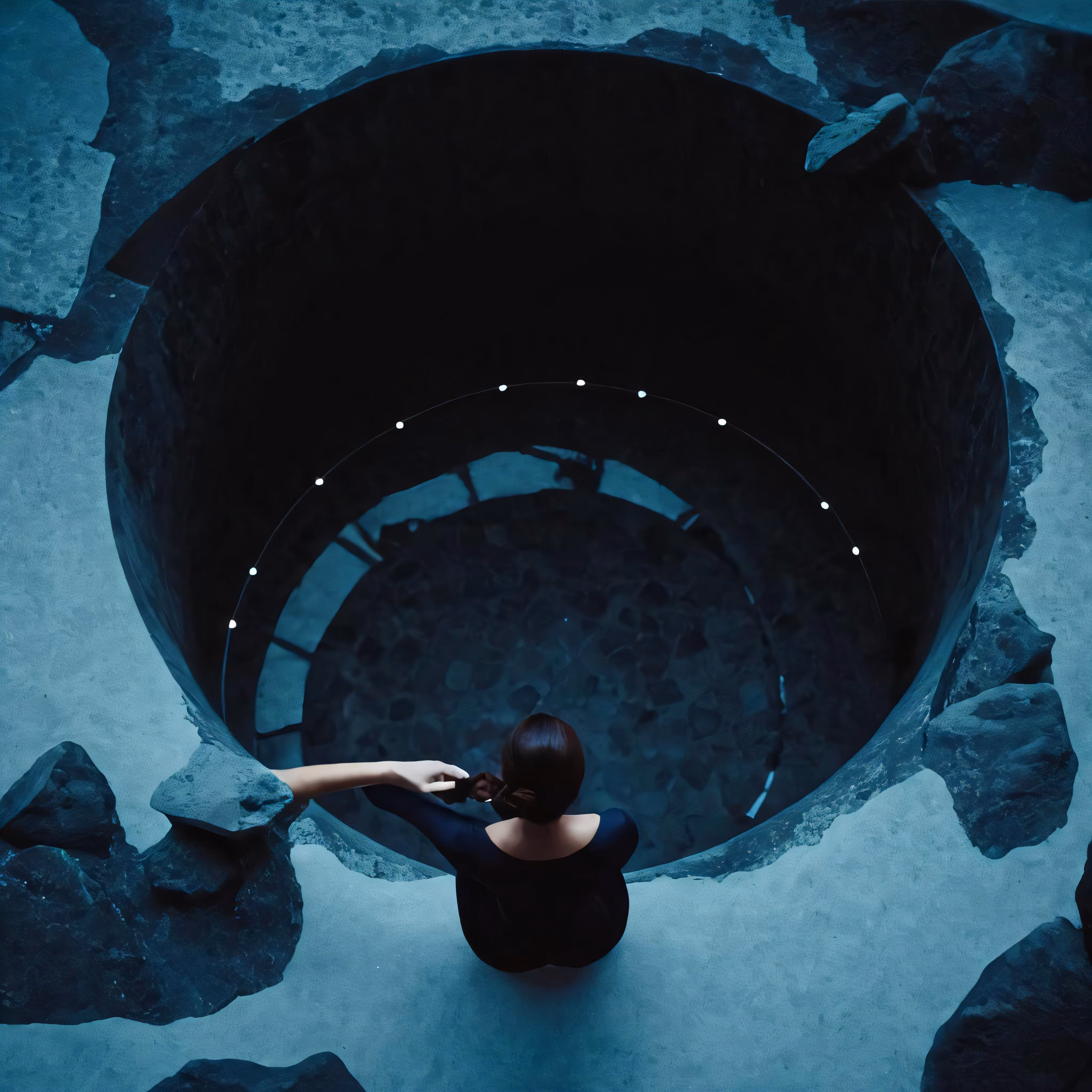 High resolution picture, free to use, woman standing in front of a round structure with rocks