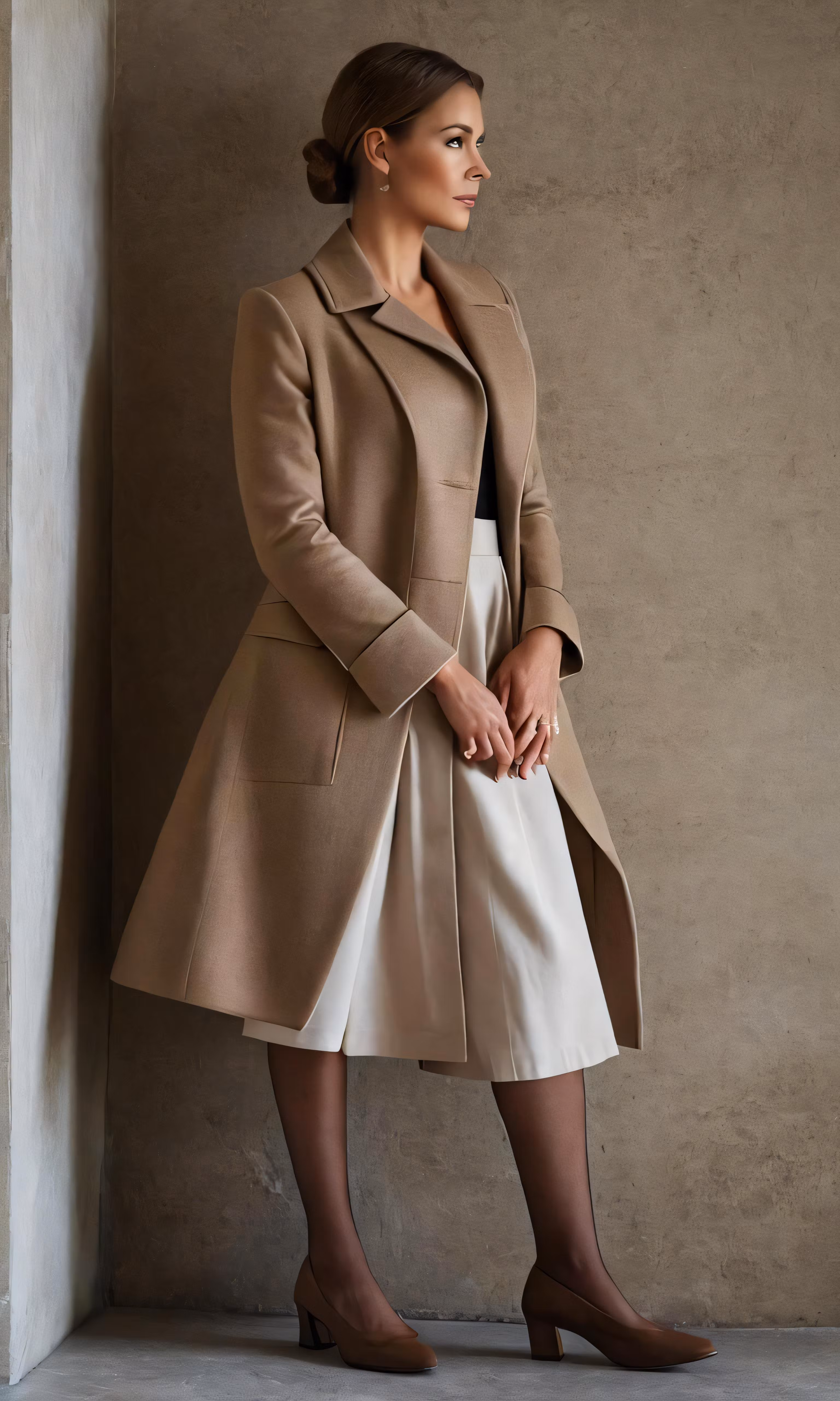 High resolution picture, free to use, woman standing in front of a wall wearing a tan coat