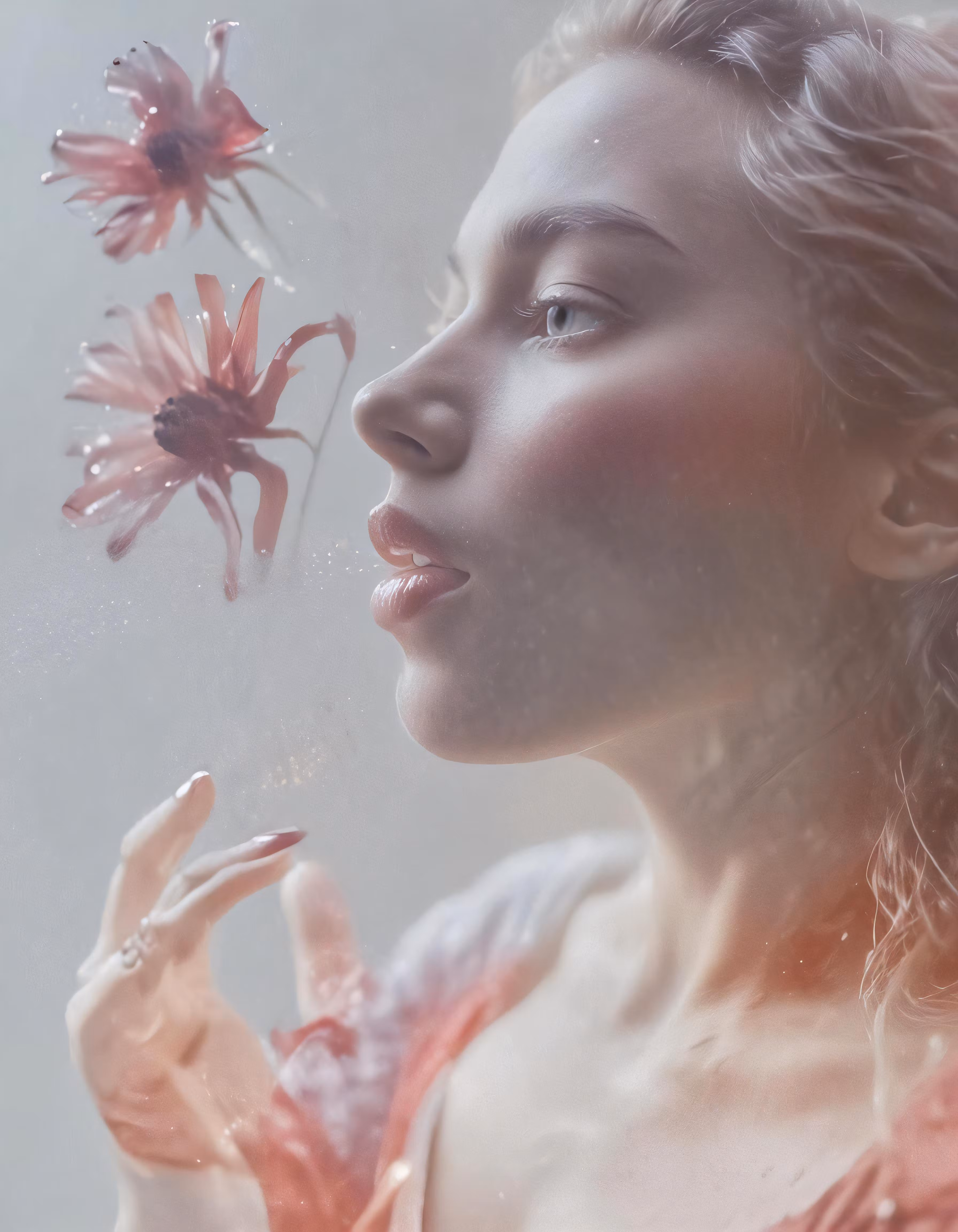 High resolution picture, free to use, woman standing in front of glass blowing on a flower