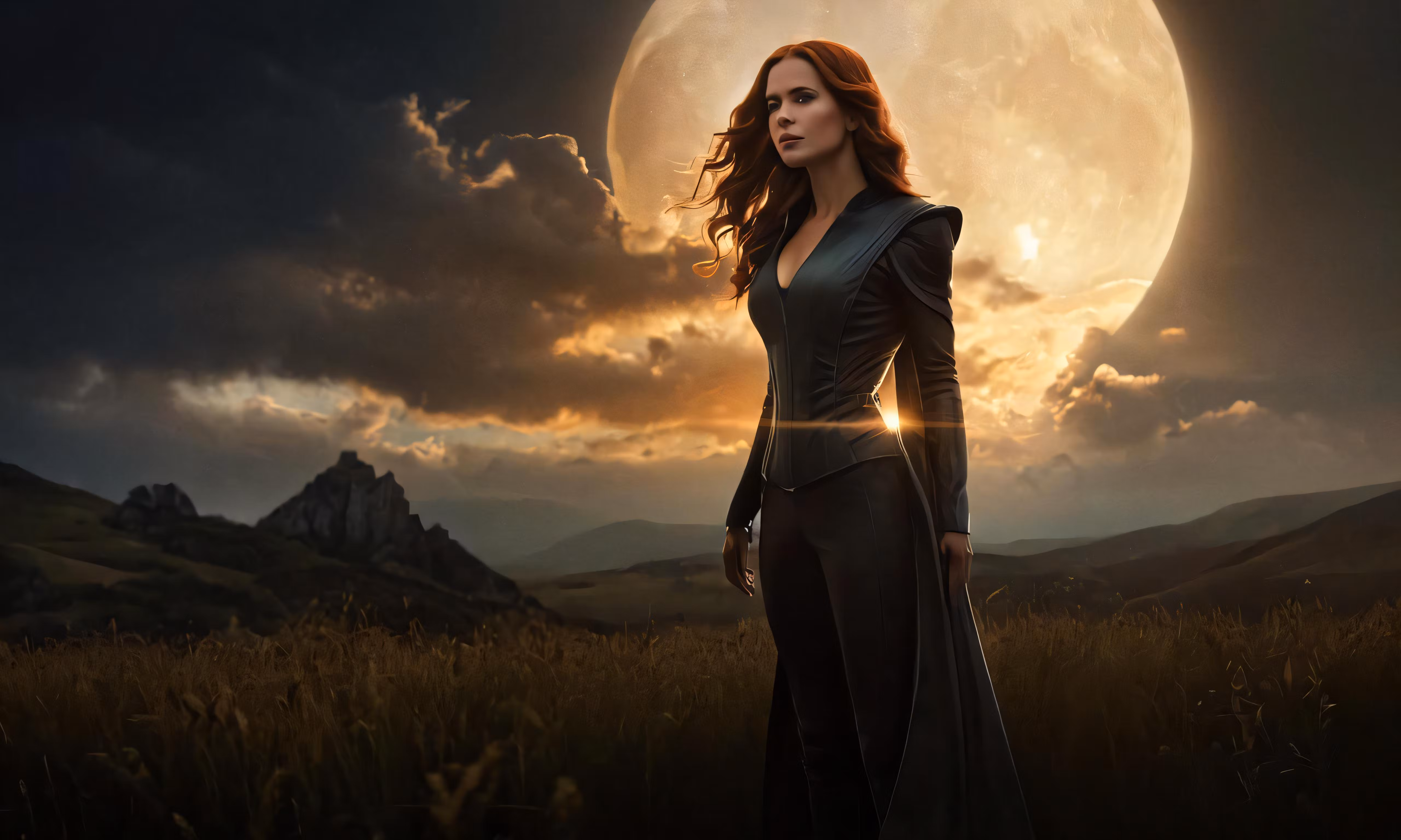 High resolution picture, free to use, woman standing in grass beneath a very large moon