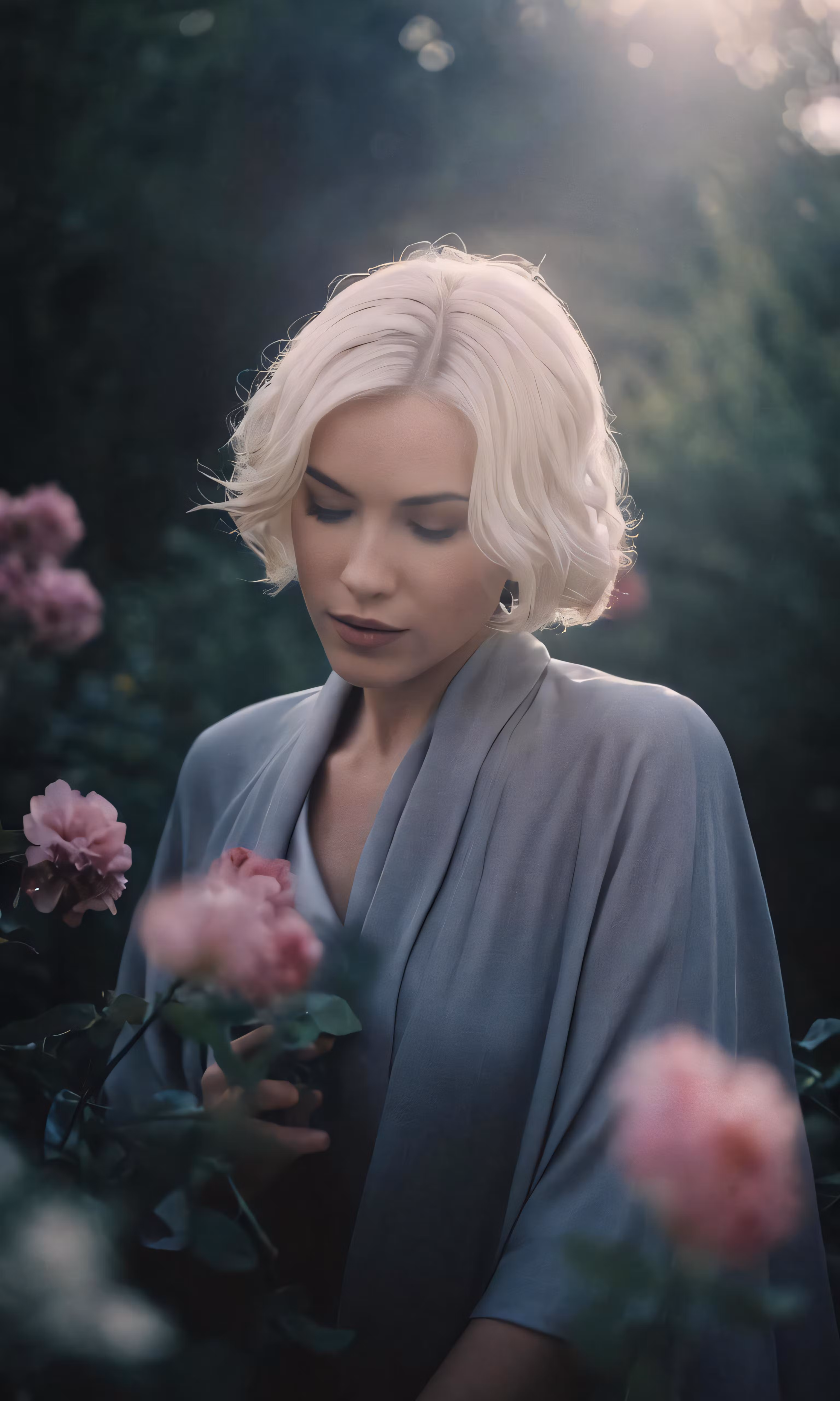 High resolution picture, free to use, woman standing near flowers looking at pink roses