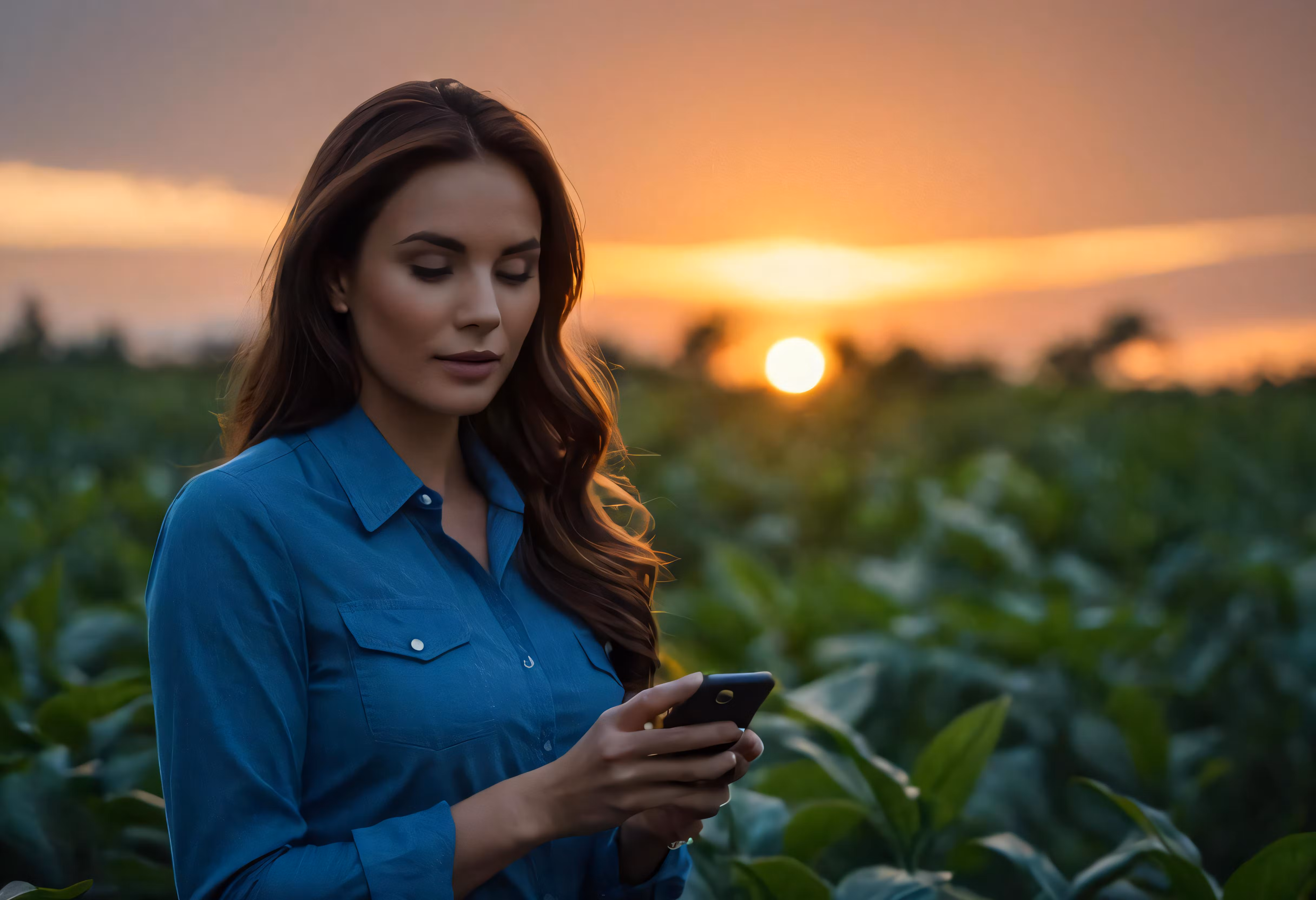 High resolution picture, free to use, woman using a cell phone in a field at sunset