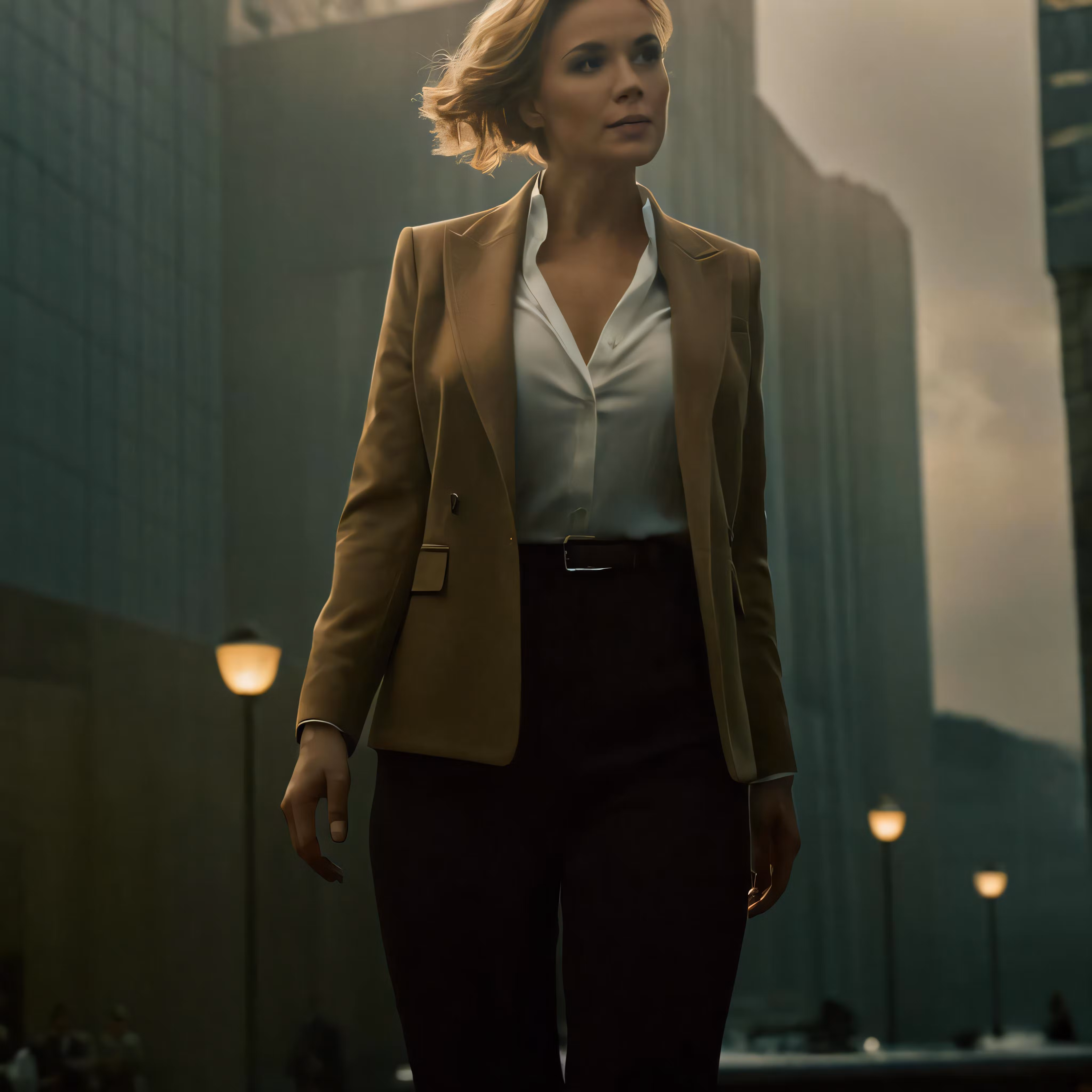 High resolution picture, free to use, woman walking in a suit in front of the city skyline