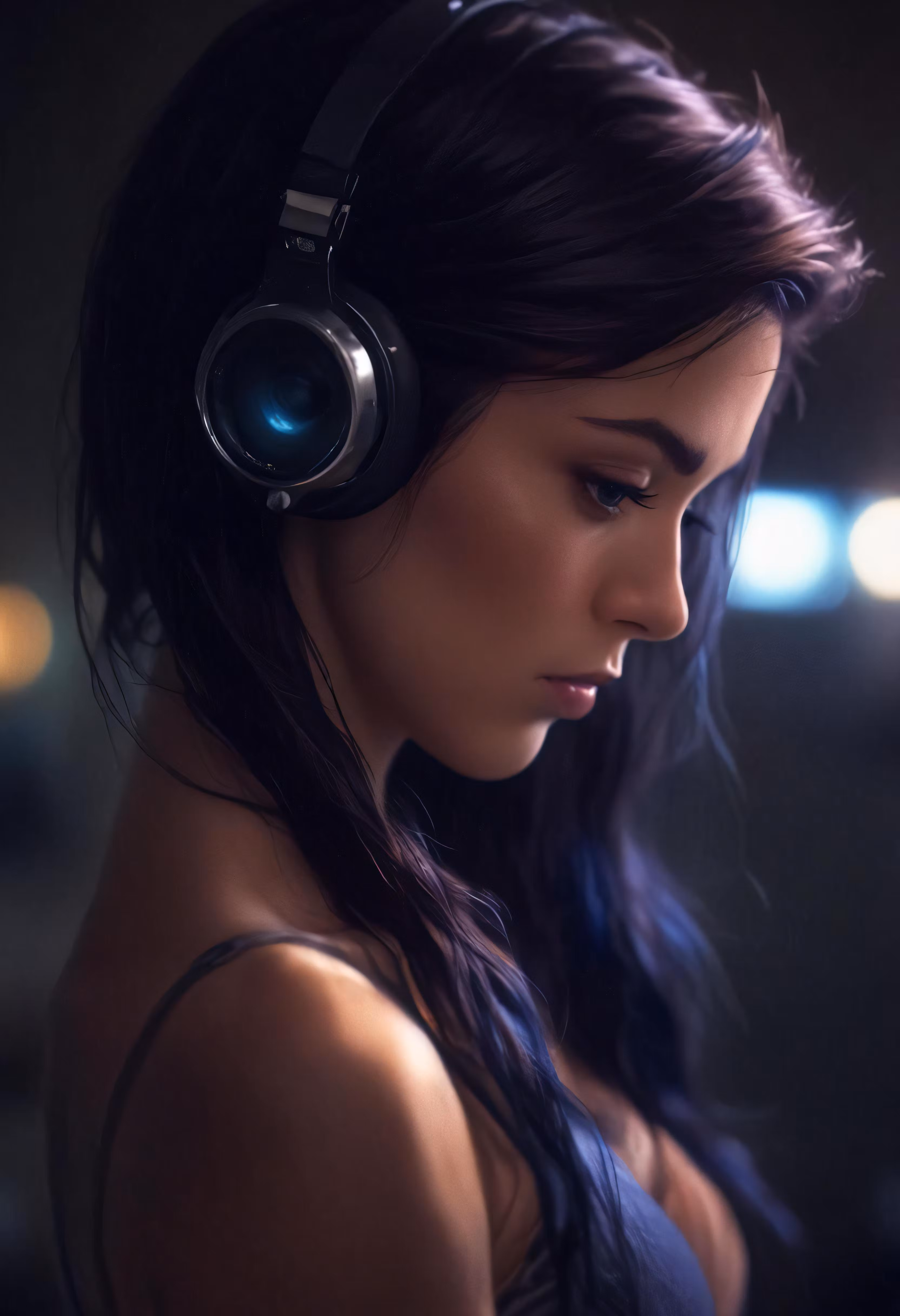 High resolution picture, free to use, woman wearing a pair of headphones looks into her phone