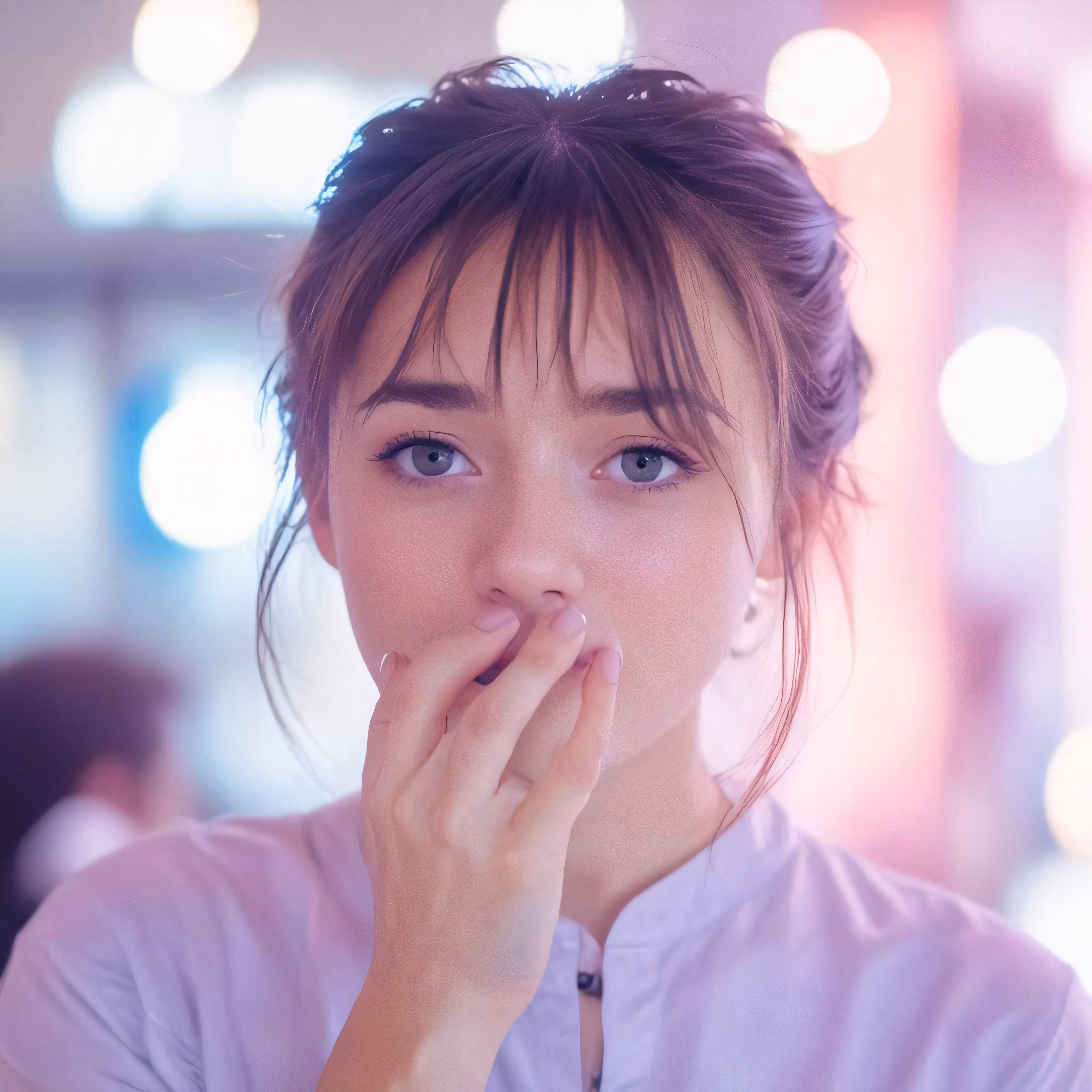 High resolution picture, free to use, woman wearing a purple shirt is rubbing her mouth