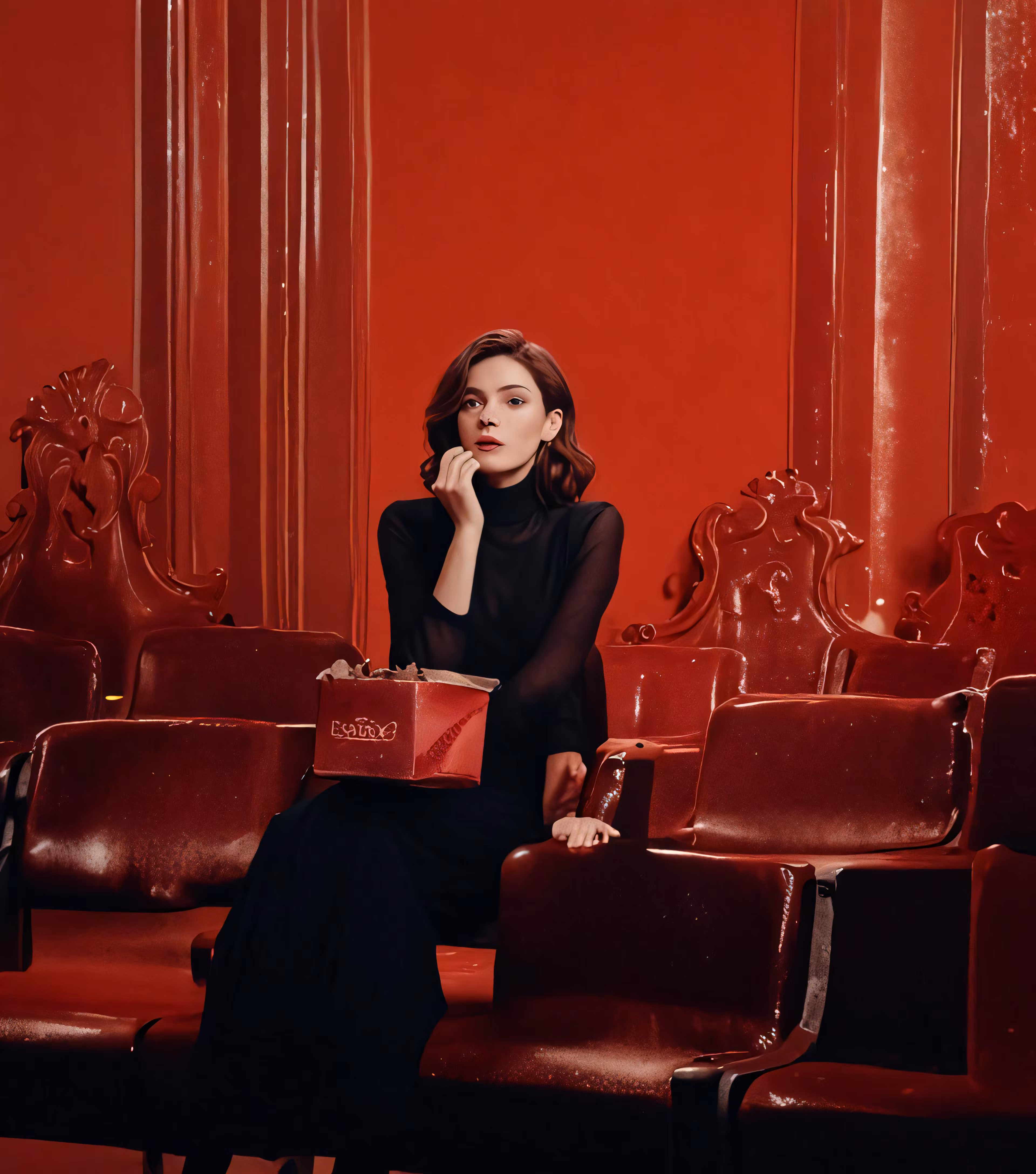 High resolution picture, free to use, woman wearing black and red dress sitting on a red chair