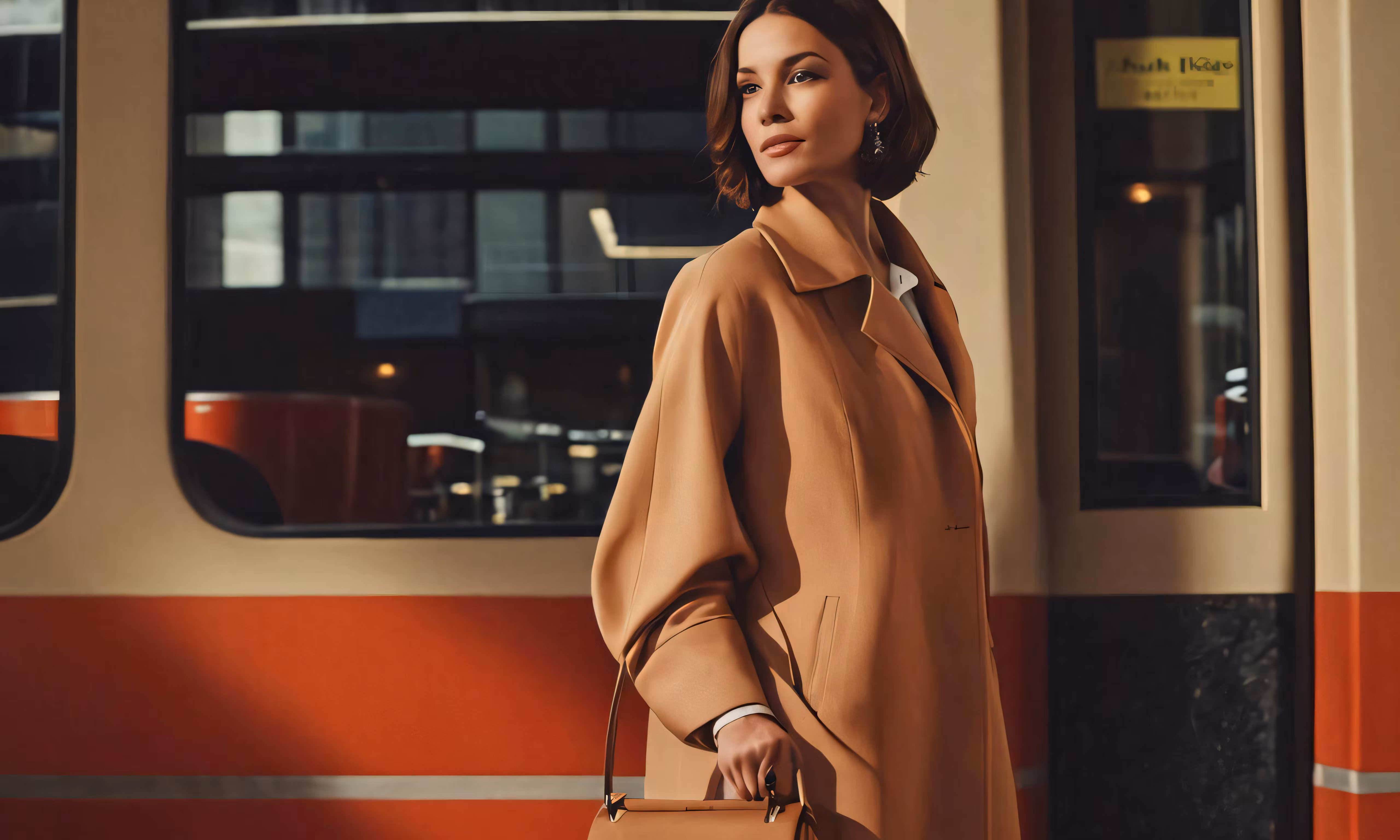 High resolution picture, free to use, woman with beige coat holding hand bag by subway